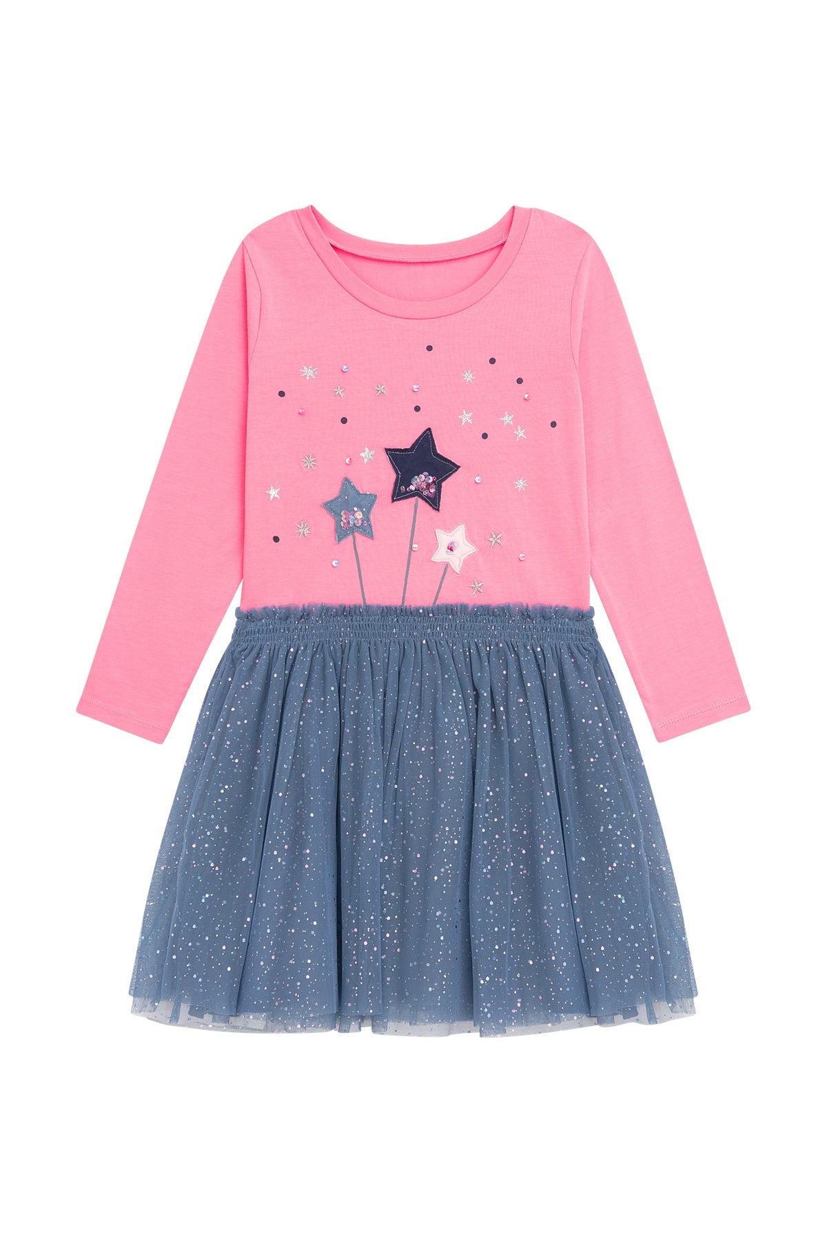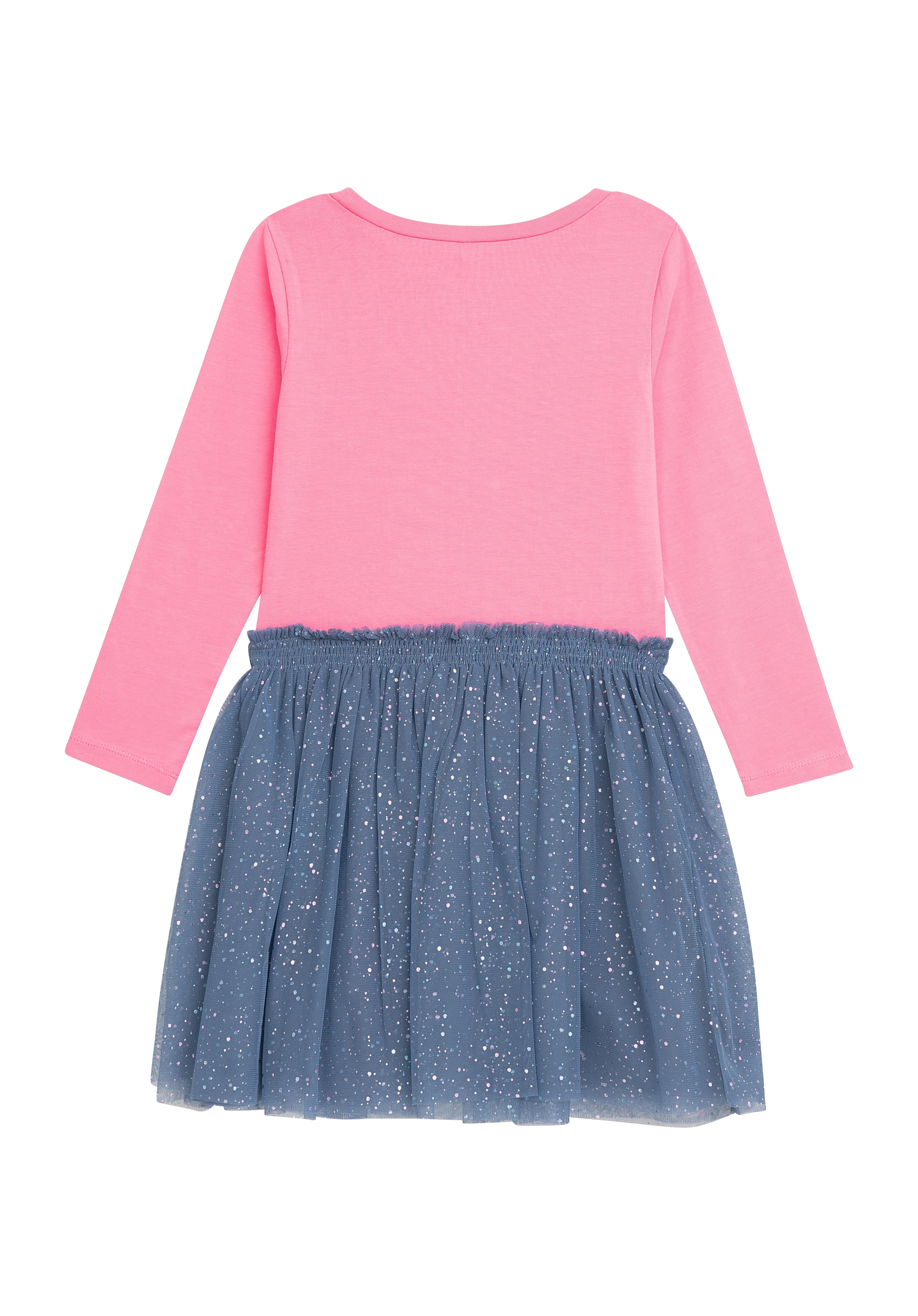 Das Kleid hat ein weiches, rosafarbenes Langarm-Oberteil mit Sternenstickerei und einen schimmernden blauen Tüllrock – perfekt für Partys, Spielnachmittage und wirbelnde Momente.