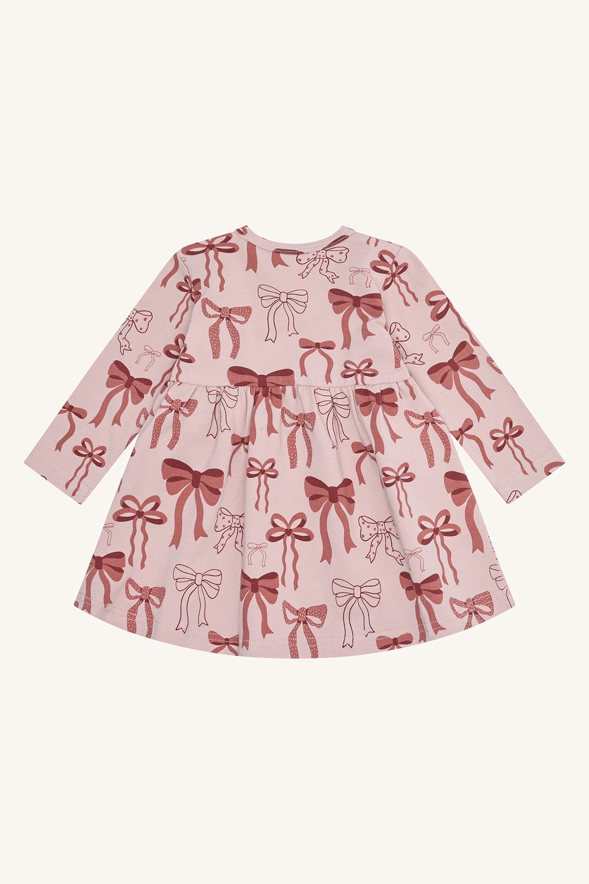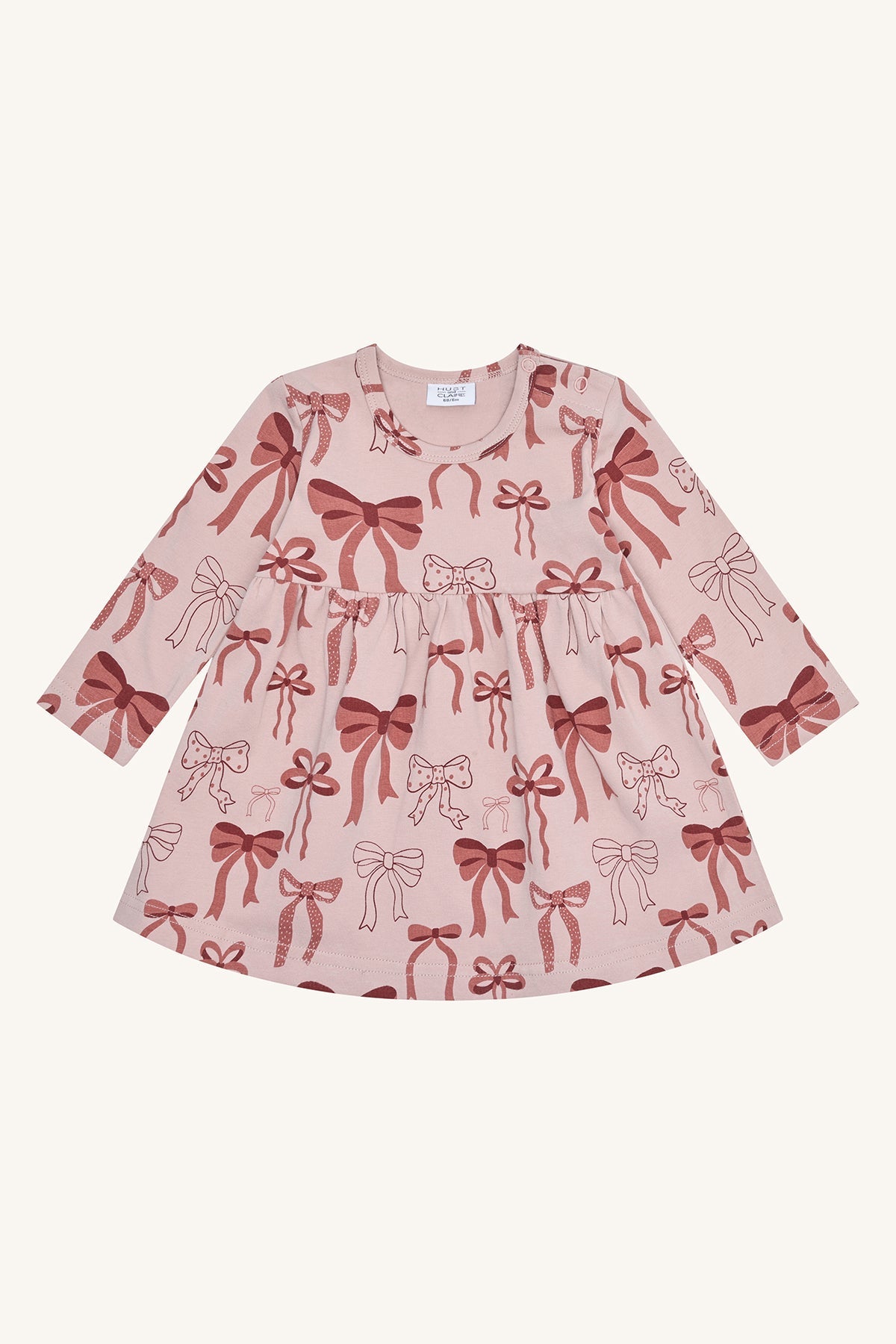 Long-sleeved dress in Adobe Rose, crafted from 95% cotton and 5% elastane for comfort and flexibility. Features a charming all-over bow print, making it perfect for everyday wear or special occasions while ensuring a gentle feel on the skin.