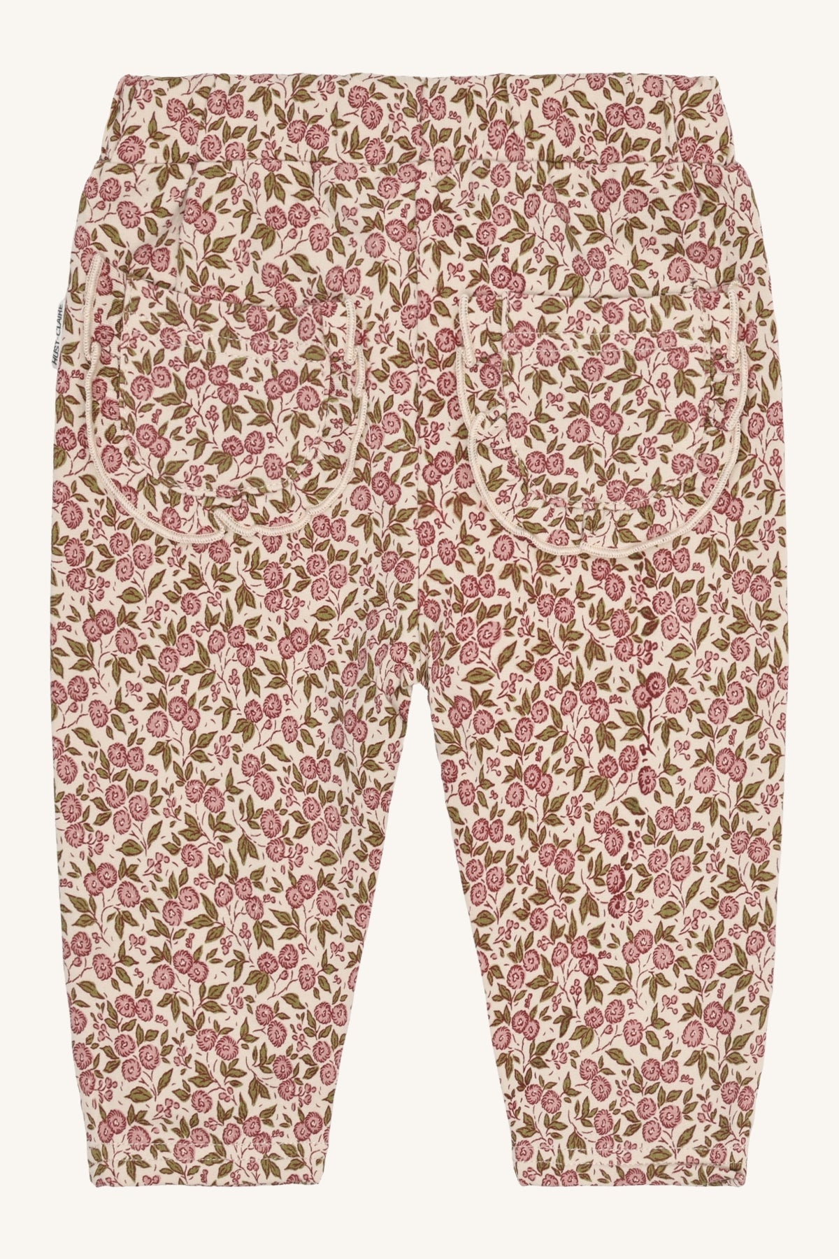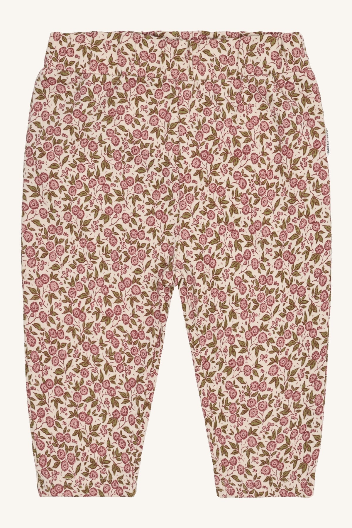 GOTS-certified organic cotton pants (97% cotton, 3% elastane) in French Oak with a charming floral print. Designed with an elastic waist for comfort and a practical back pocket, perfect for stylish and easy everyday wear.
