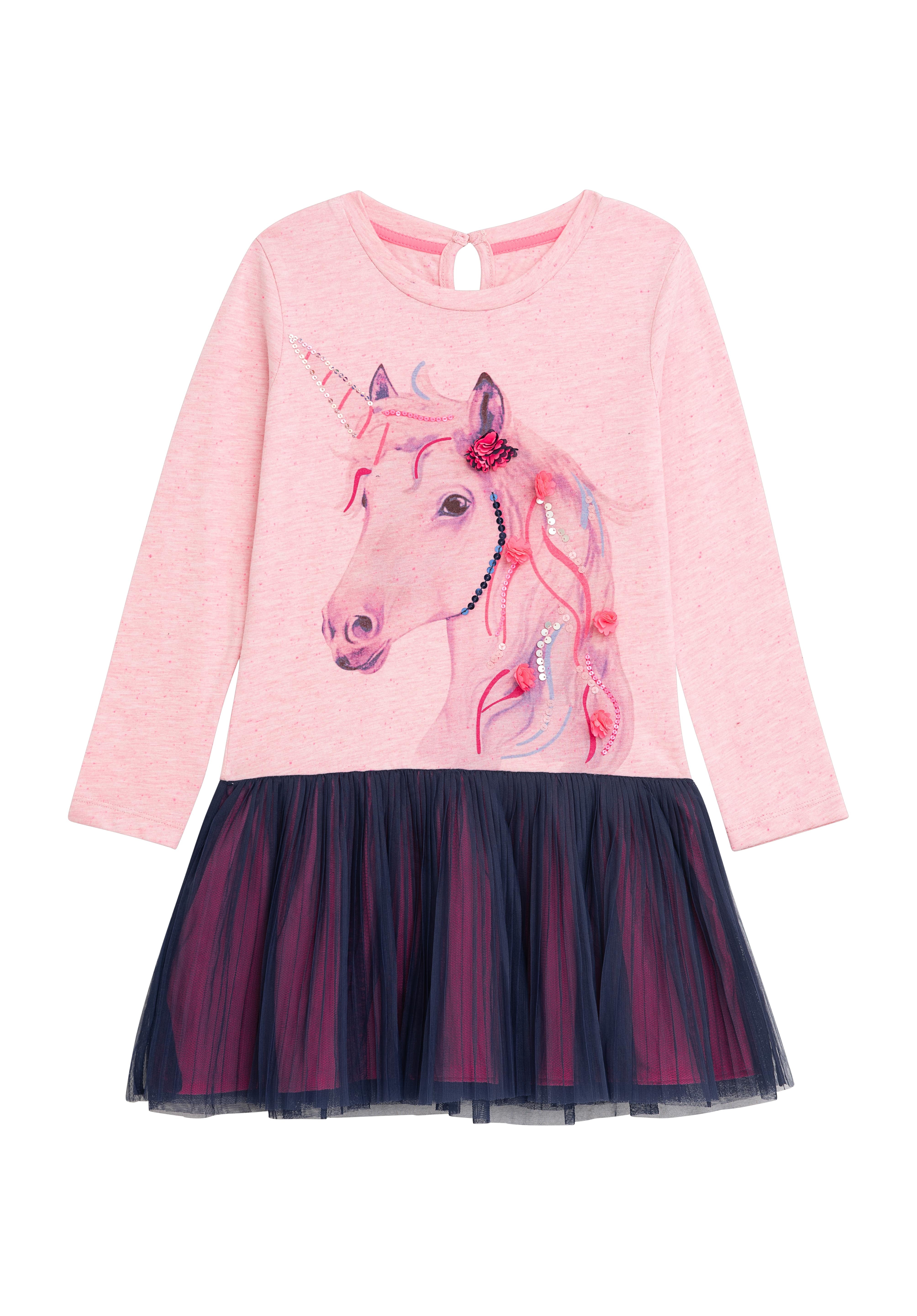 This rose dress features a magical unicorn print 🦄 with sequin accents on the top, adding a touch of sparkle to your little one's outfit.Â