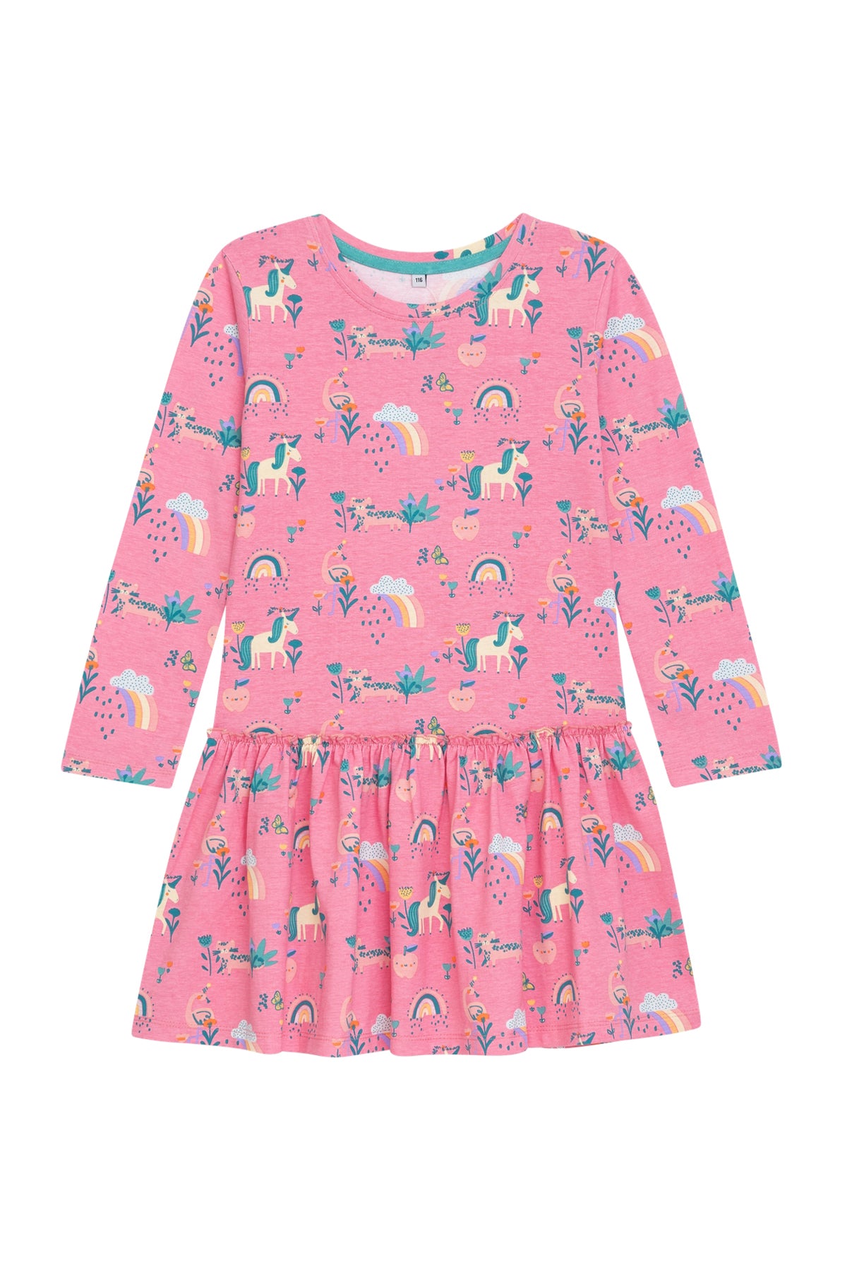 This tender pink dress features enchanting unicorn, rainbow, and floral prints, bringing a magical touch to your little one’s wardrobe.