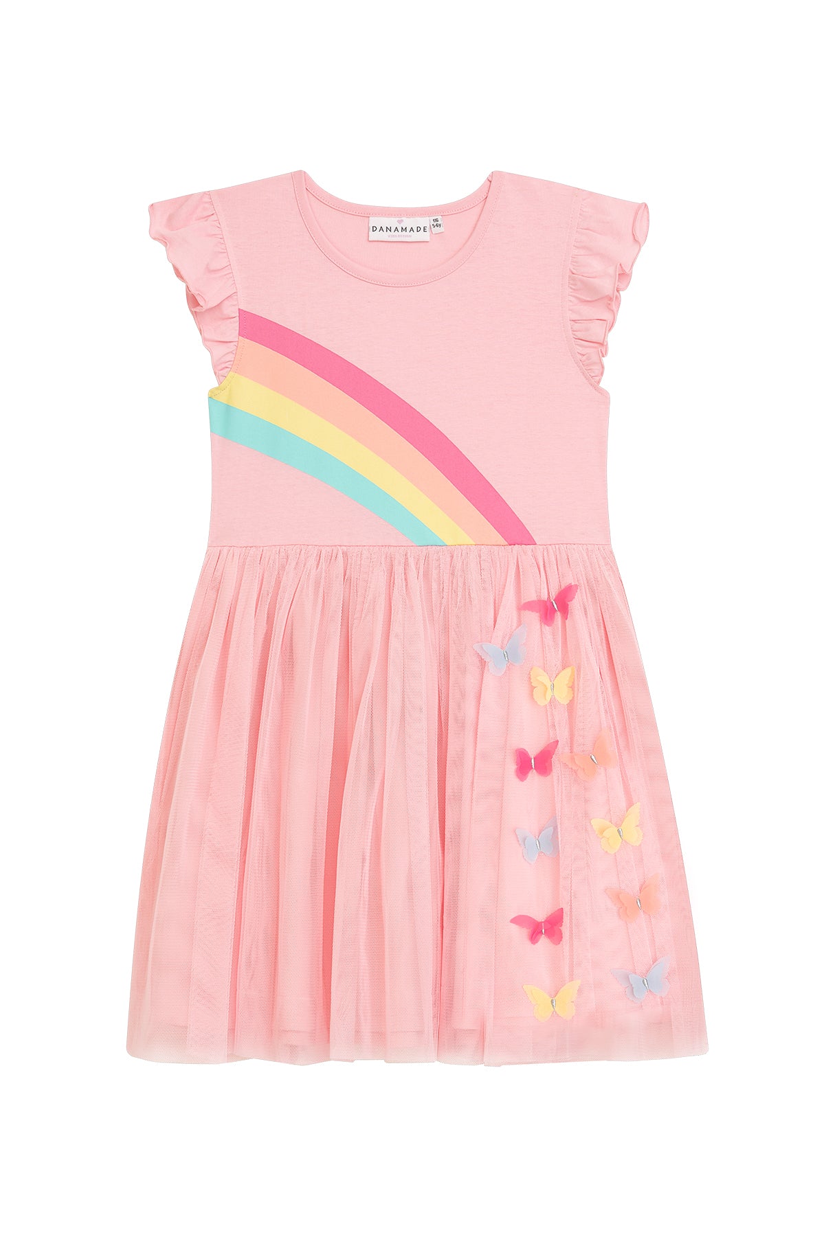 Danamade DPALMIRA Girls Ruffled Short Sleeves Dress with Rainbow and Butterflies - Rose