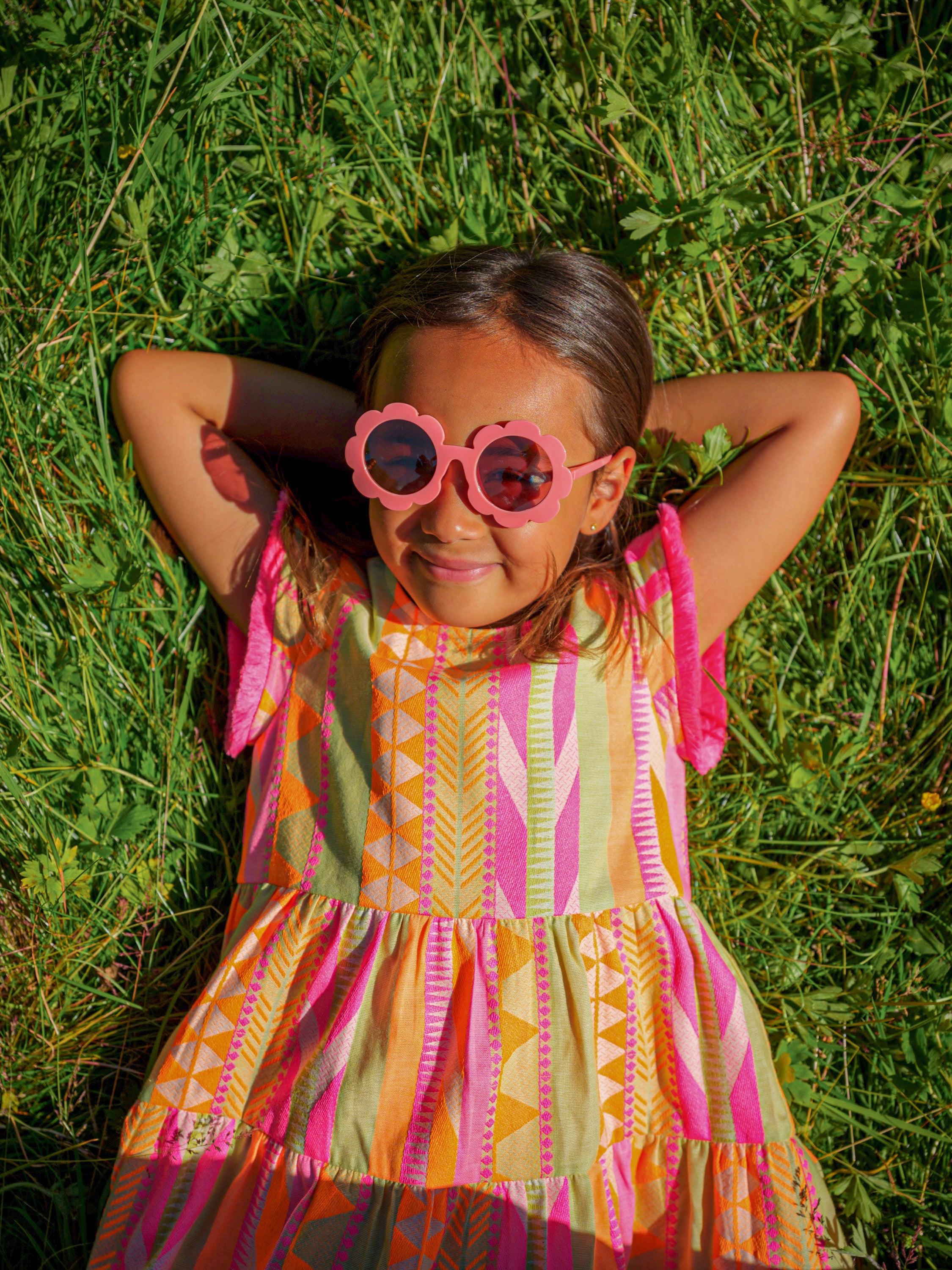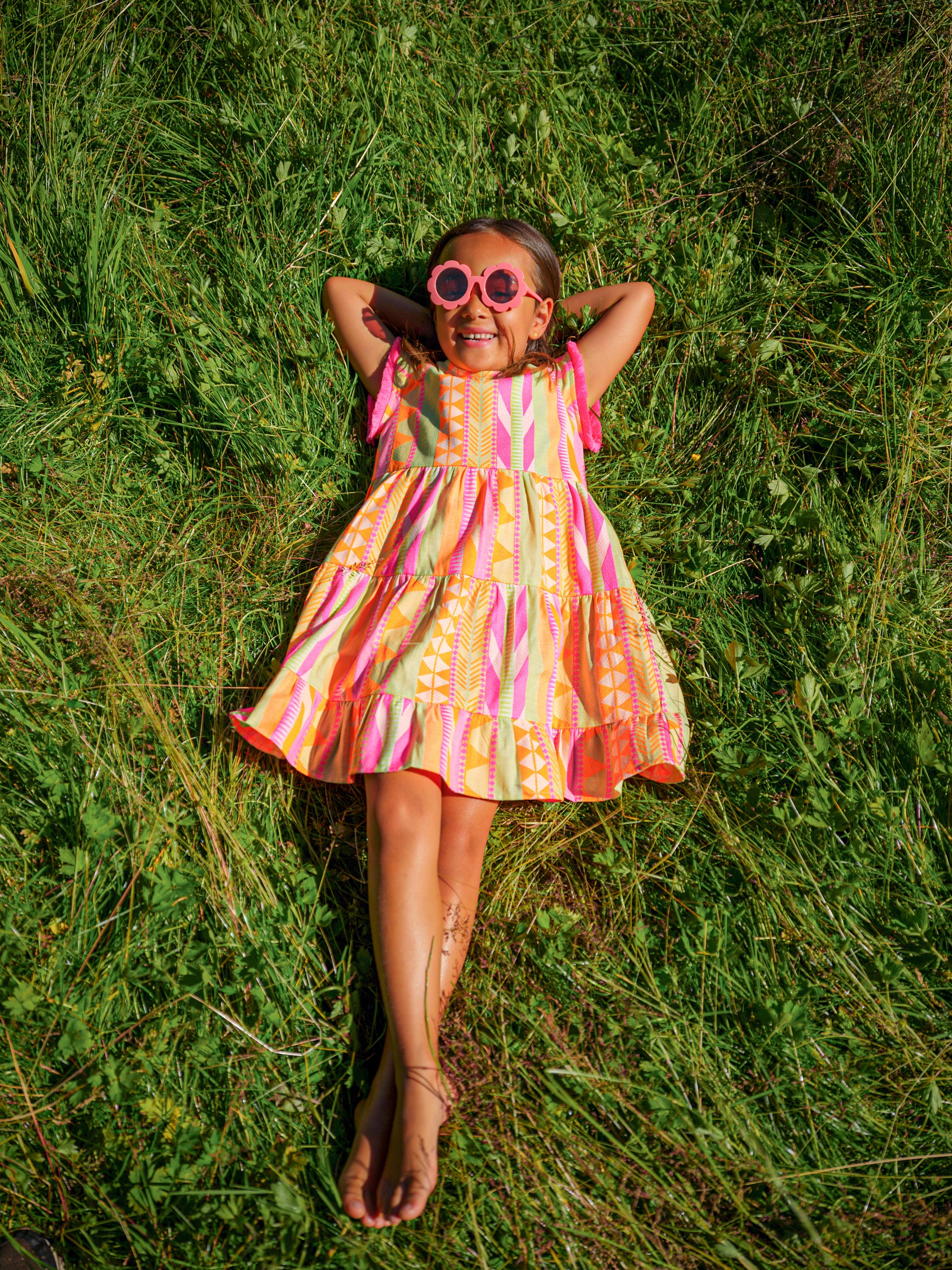 Danamade DSERENA Girls Short Cap Sleeves Geometric Print Dress – Neon Pink