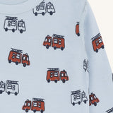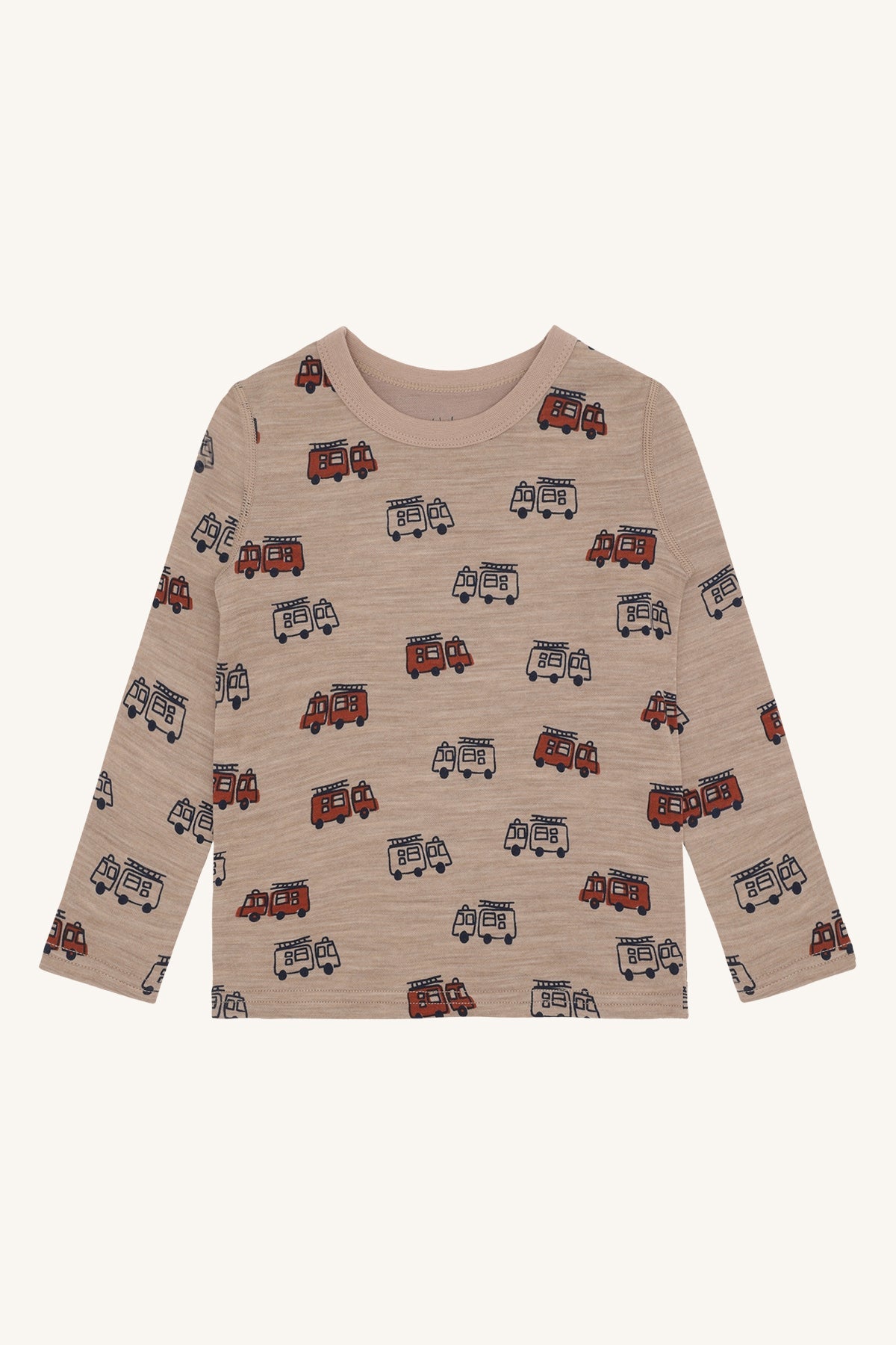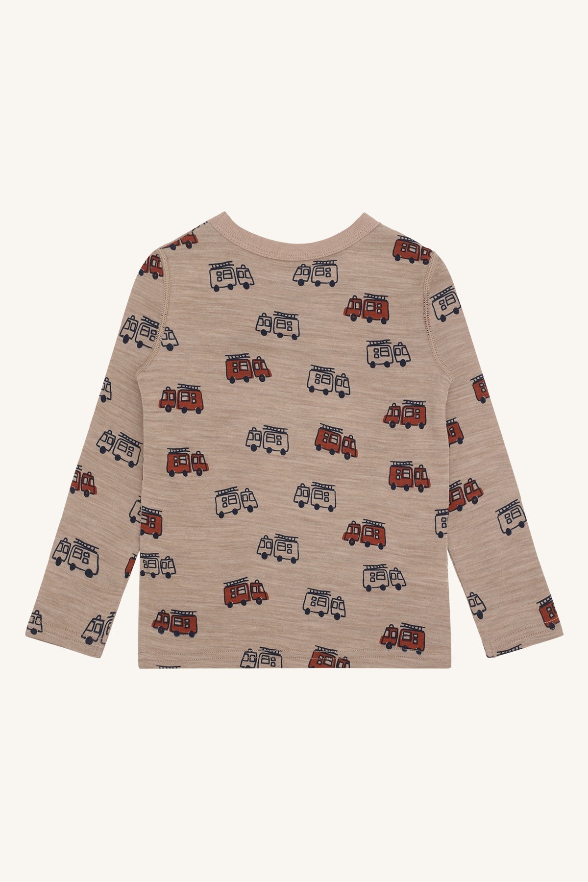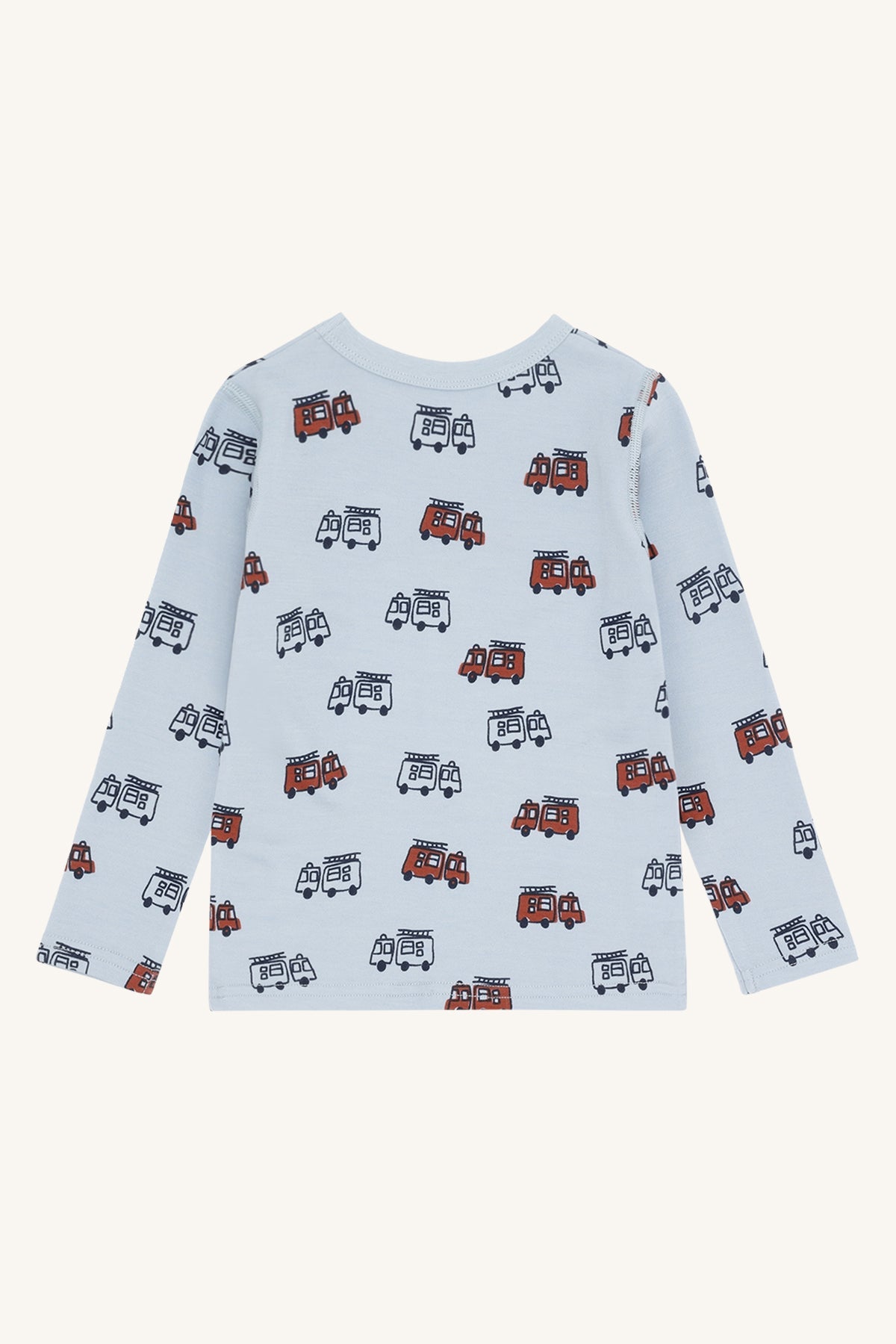 Long-sleeved t-shirt in biscuit and baby blue with fire truck print, made from 50% wool, 45% bamboo viscose, and 5% polyamide. Certified Oeko-Tex 100, featuring soft stretch fabric, wool outside, and bamboo viscose lining for comfort and warmth.