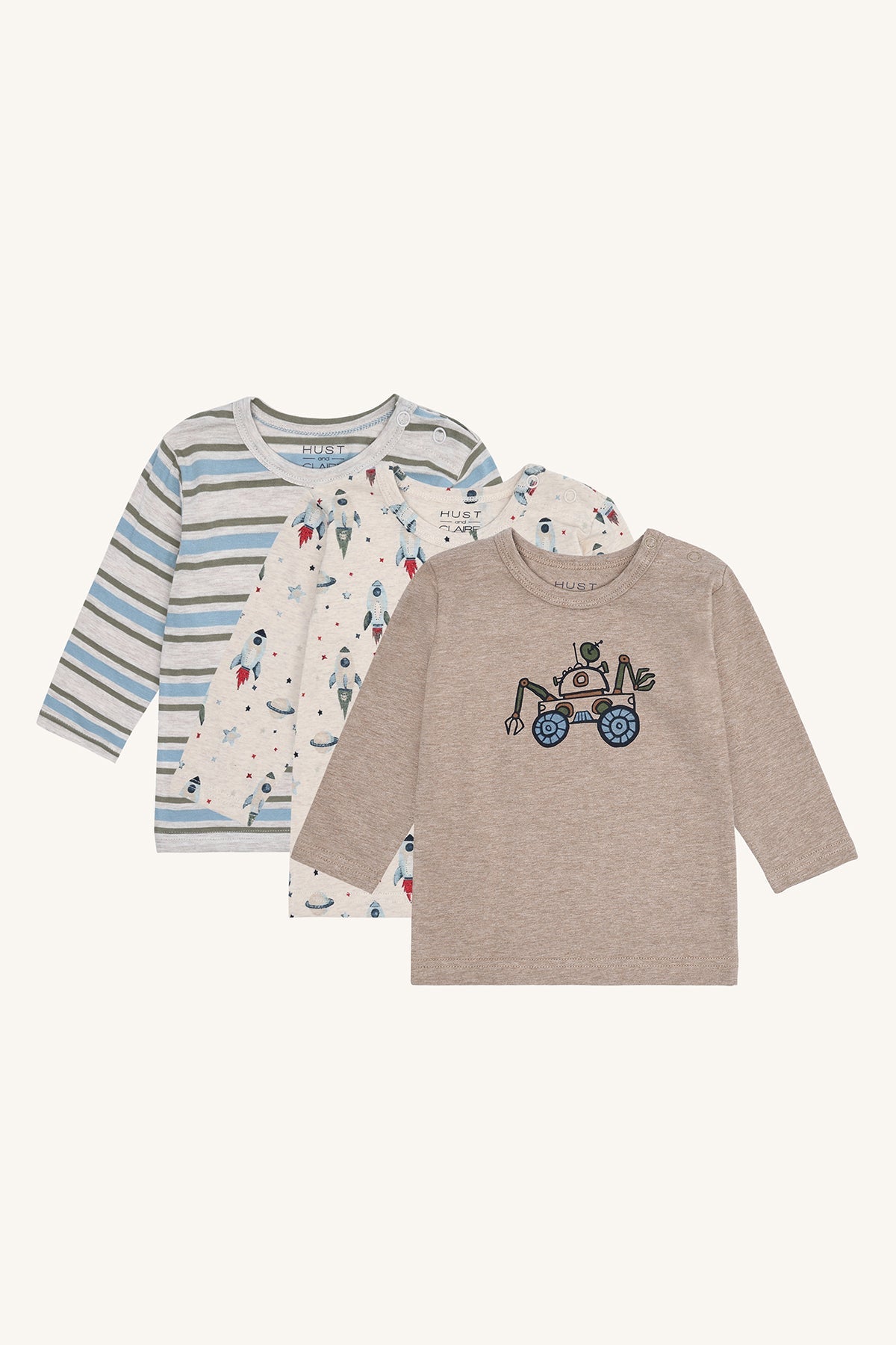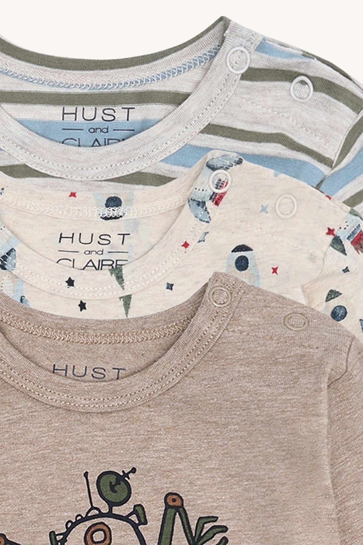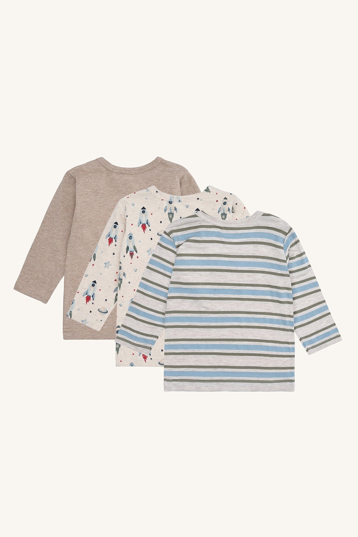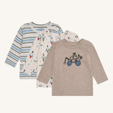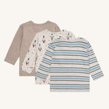 3-pack long-sleeved t-shirts in Wheat Melange, made from 95% cotton and 5% elastane. Each t-shirt features a different design and snap buttons on the left shoulder for easy dressing. Soft, stretchy, and comfortable for everyday wear.
