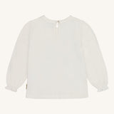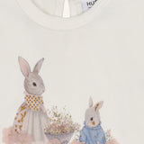 Long-sleeved T-shirt in soft organic cotton (95%) with 5% elastane for stretch. Features a charming bunny motif on the front, ruffled sleeves, and cuffed edges. Comes in Sugar and, Adobe Rose.