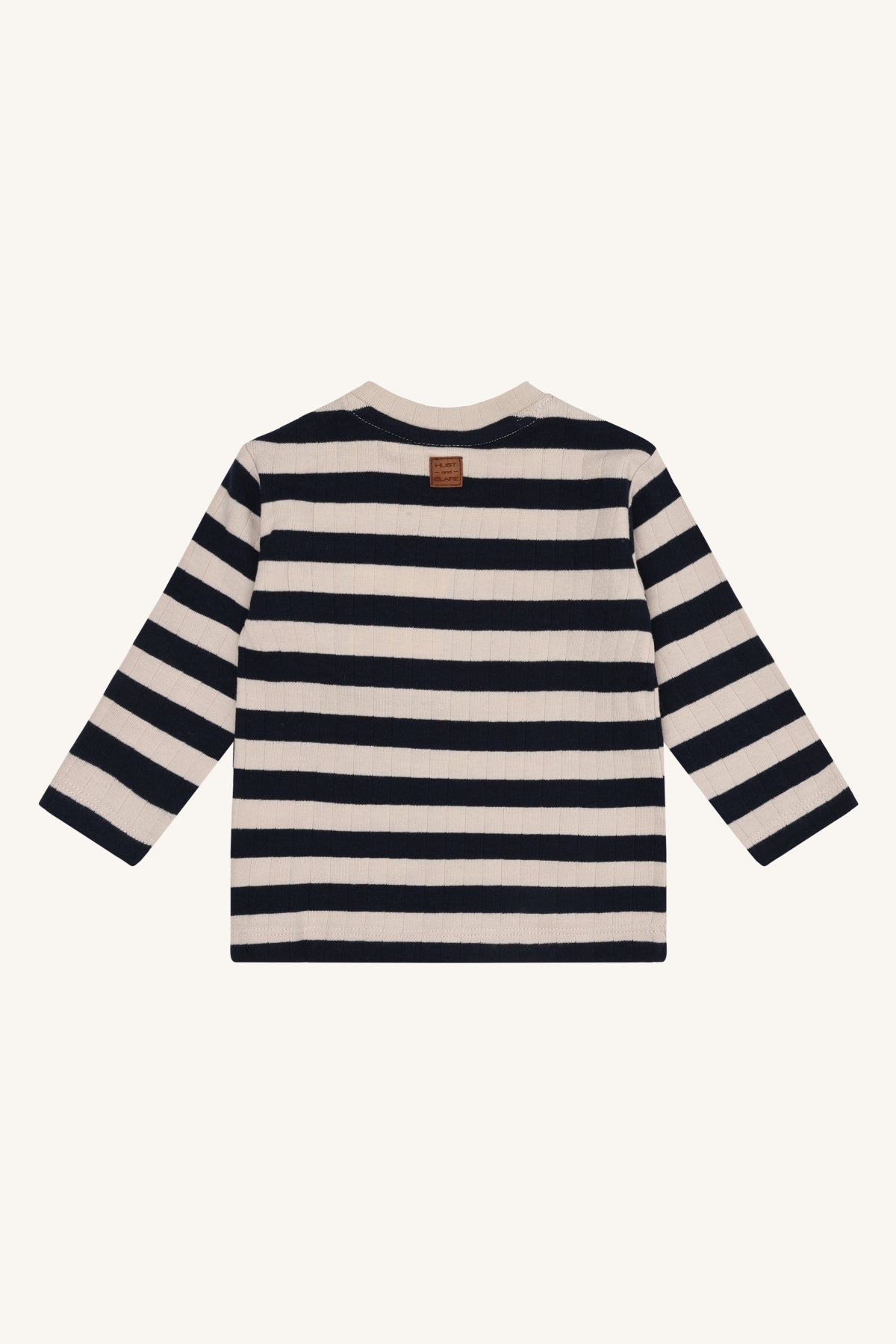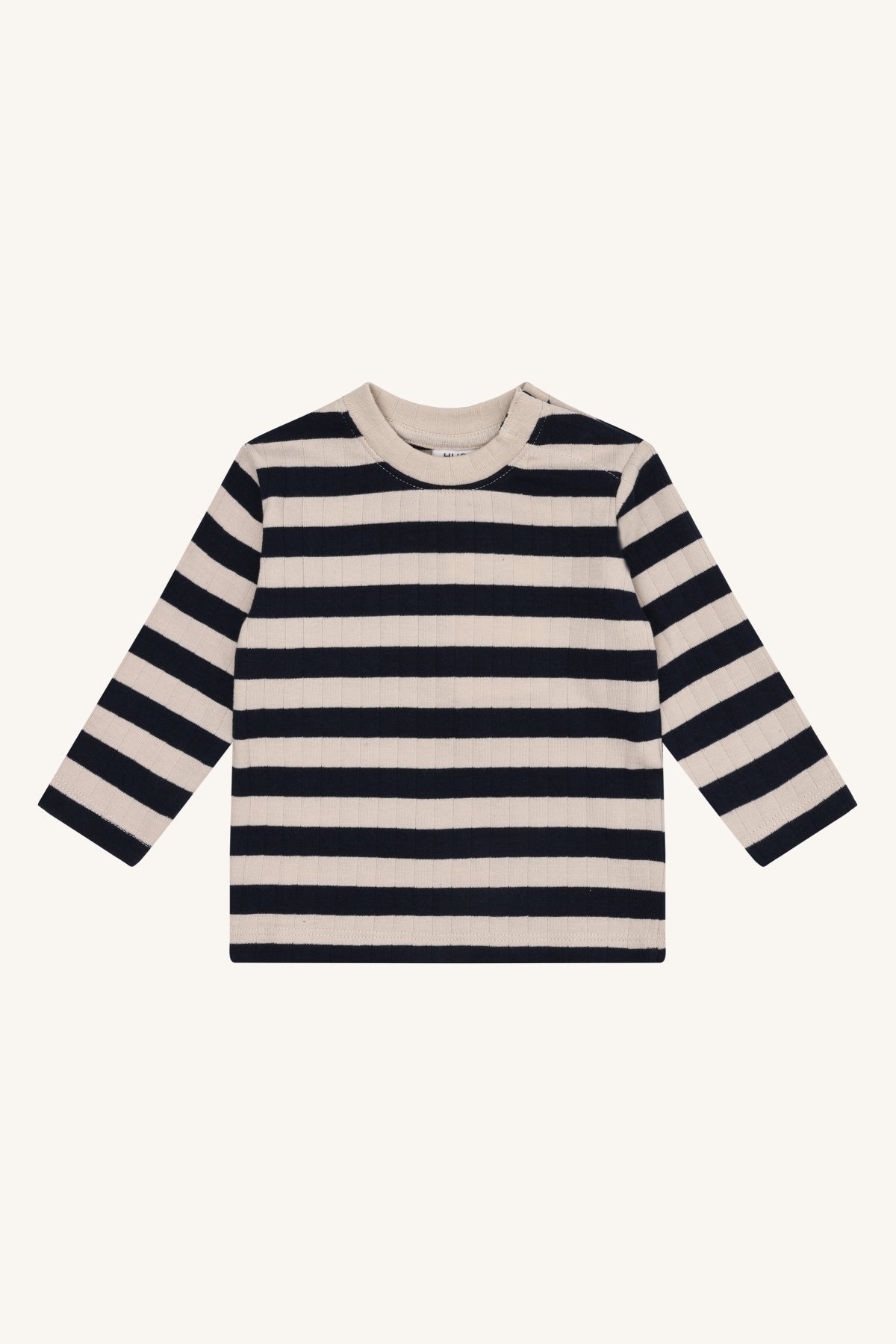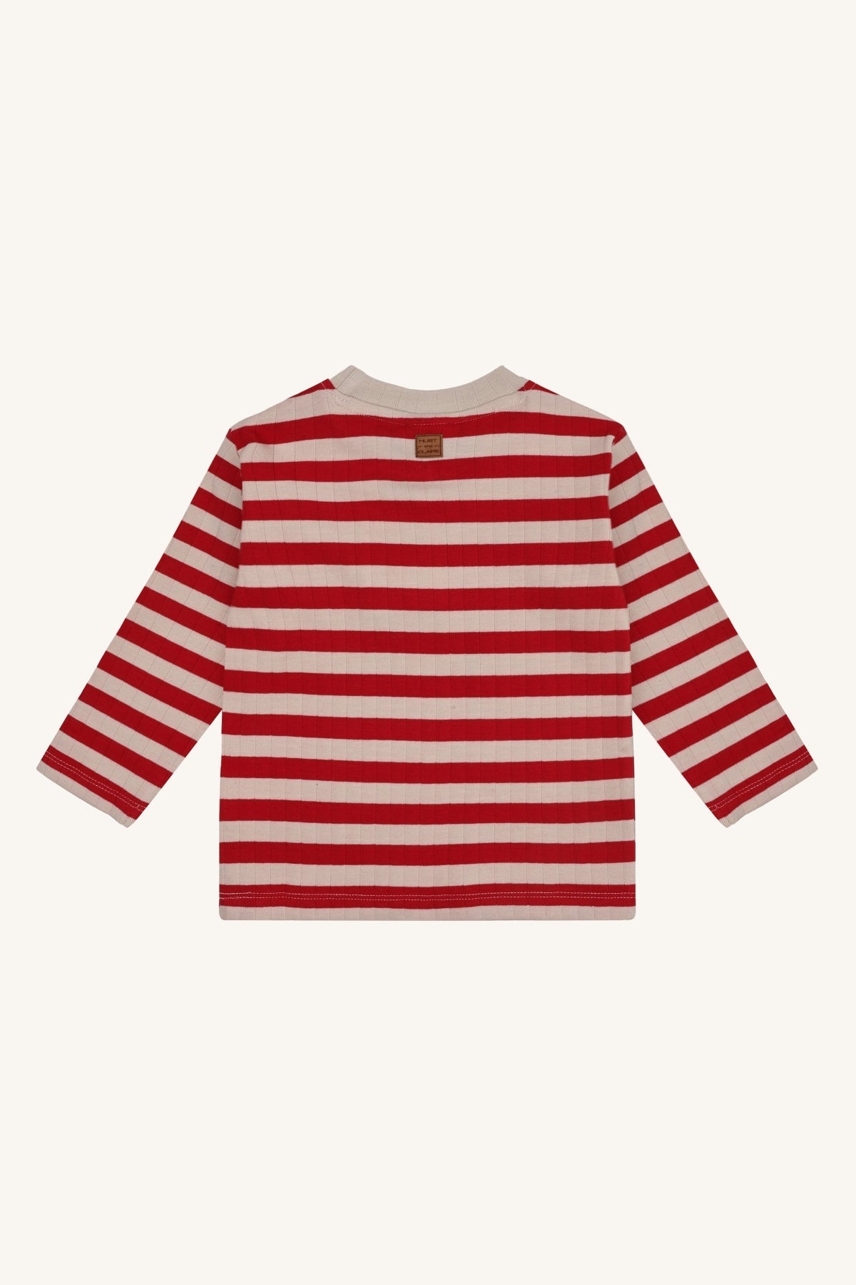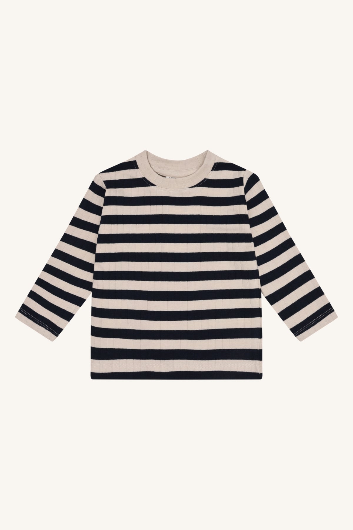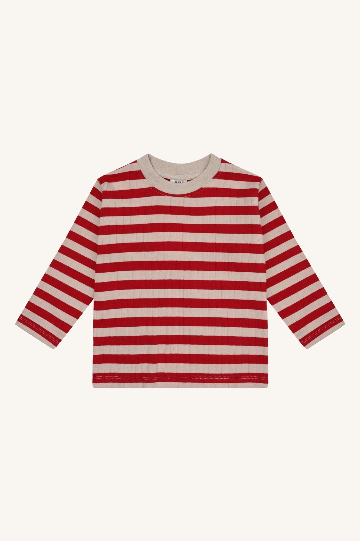 Long-sleeved T-shirt in soft organic cotton with a wide rib structure and classic stripes. Made of 95% Cotton, 5% Elastane. GOTS-certified for sustainable fashion. Available in Warm Red, More Navy, and Turtle.