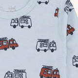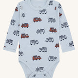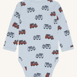 Long-sleeved bodysuit in Biscuit or Baby Blue with fire truck print. Made from 50% wool, 5% polyamide, 45% bamboo viscose, it features button closures at the left shoulder and crotch, with soft bamboo viscose inside and wool outside.