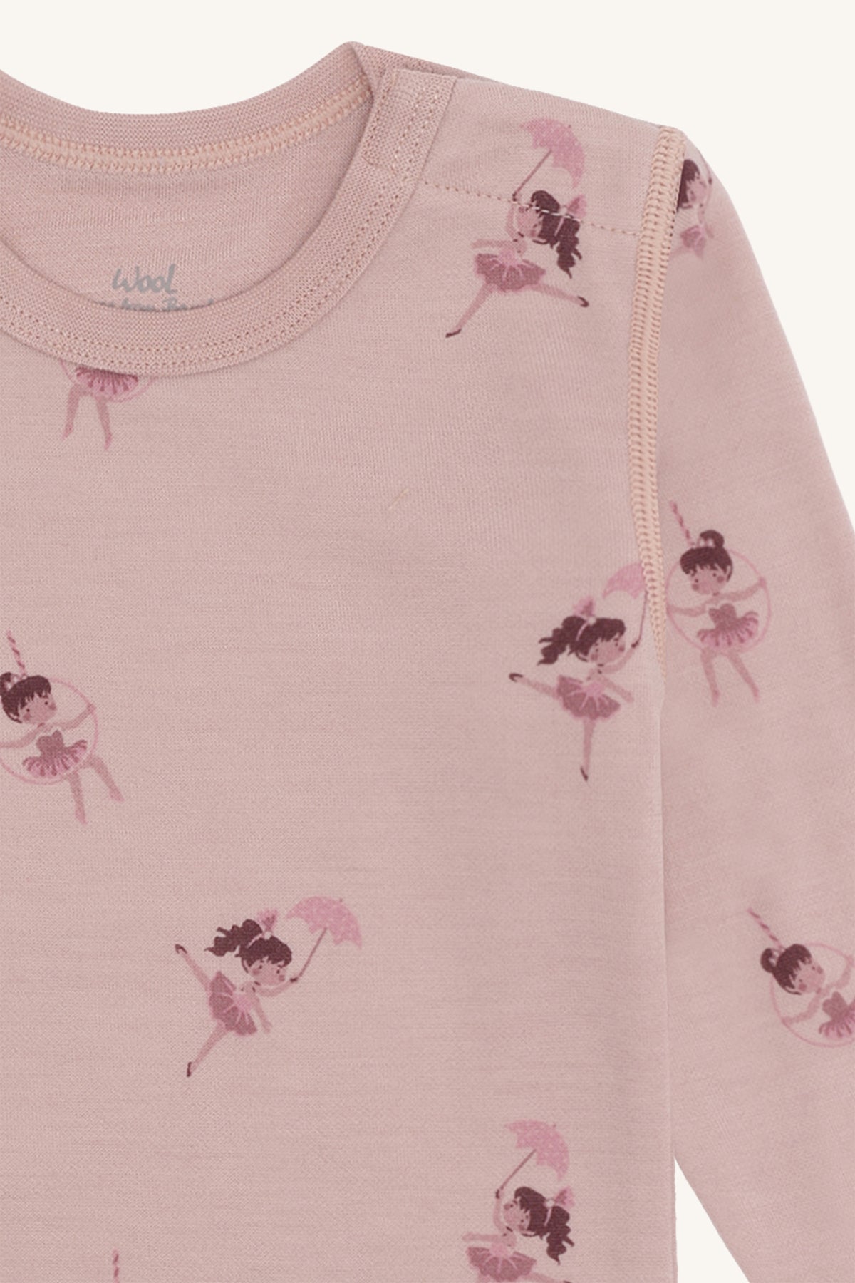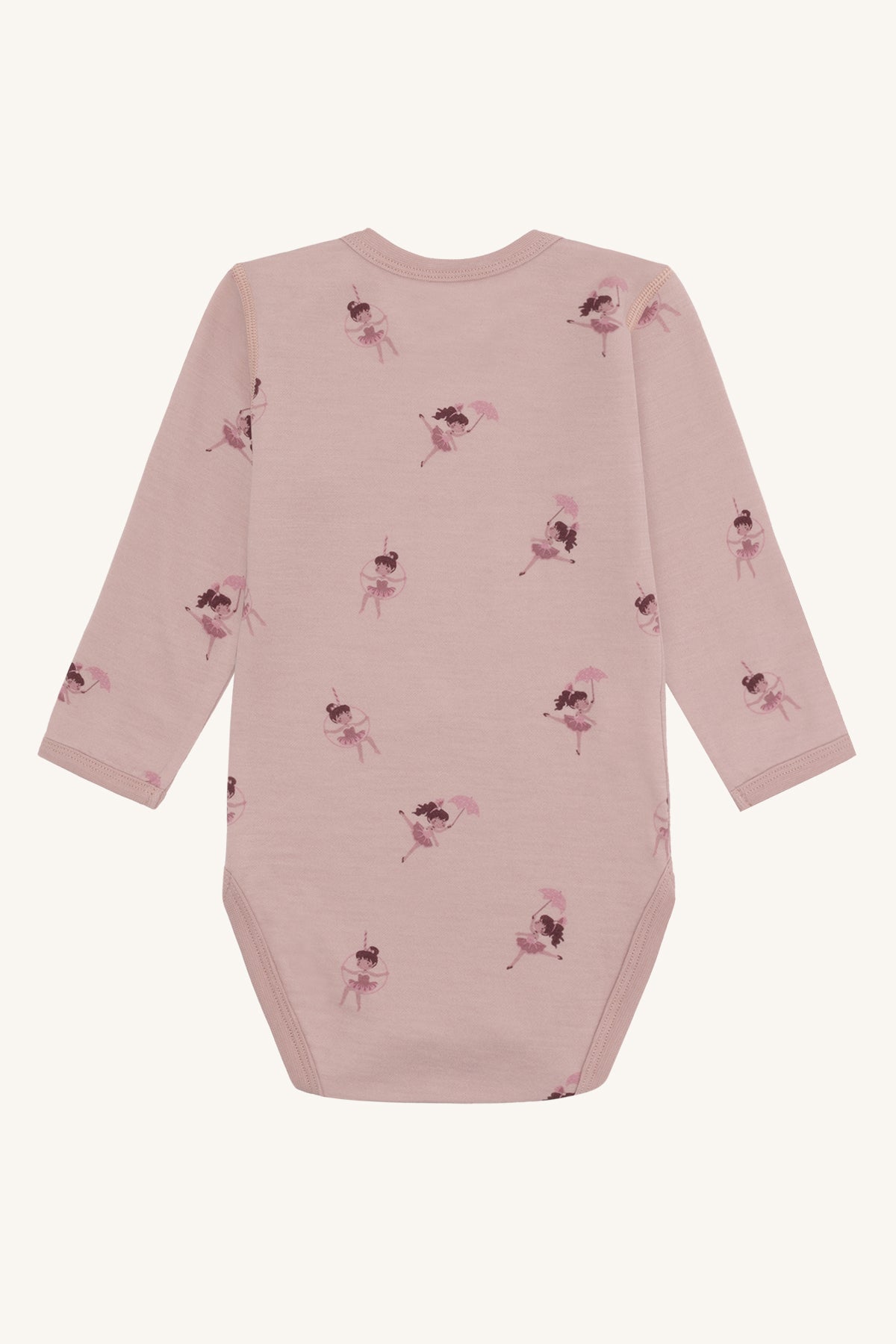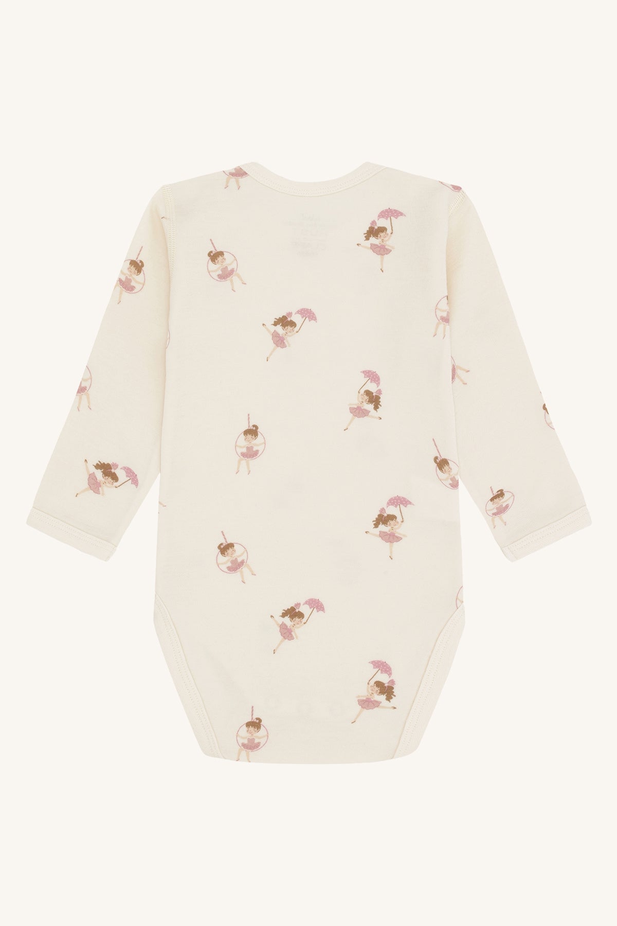 Long-sleeved body in Off White or Adobe Rose with a dancer all-over print. Made from 50% wool, 5% polyamide, 45% viscose (from bamboo) for soft, stretchy comfort. Fastens on the left shoulder and between the legs. Oeko-Tex 100 certified.