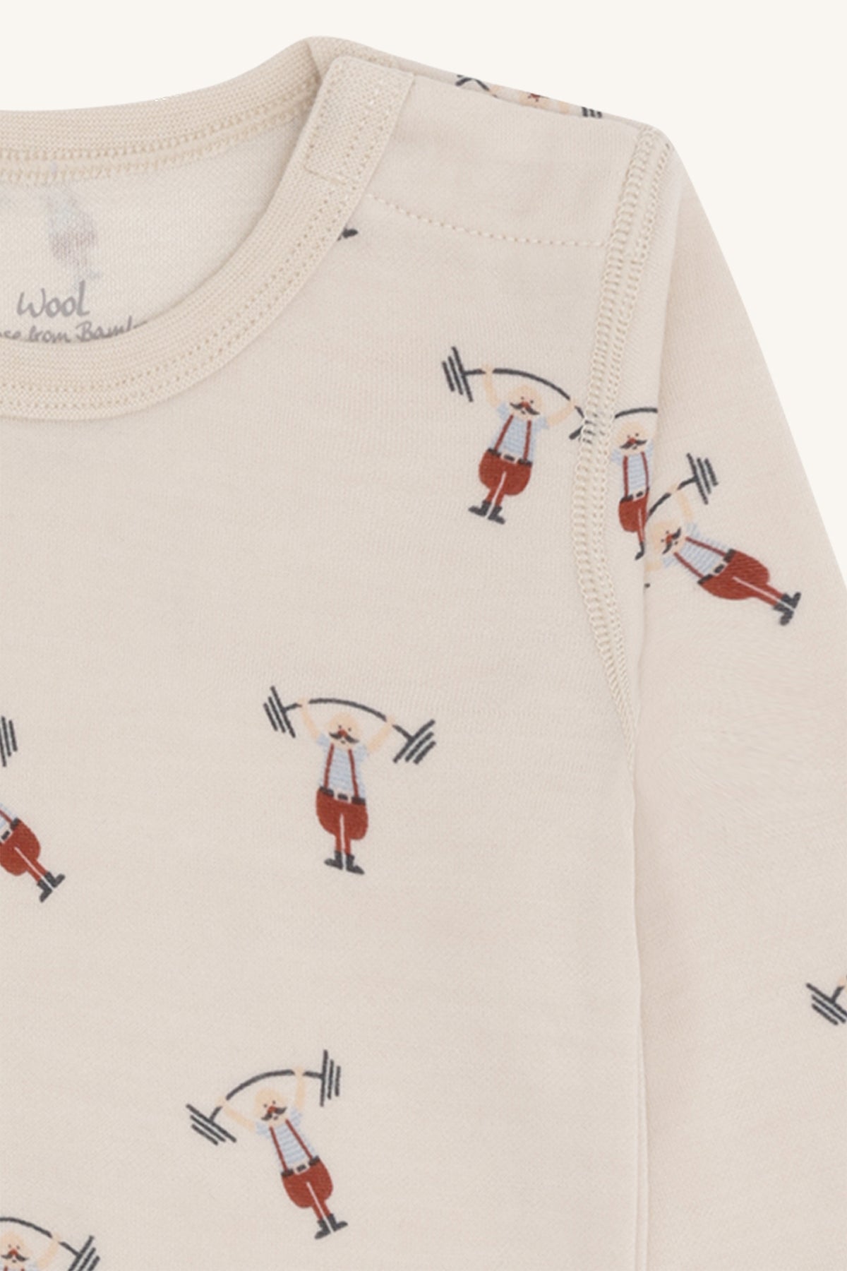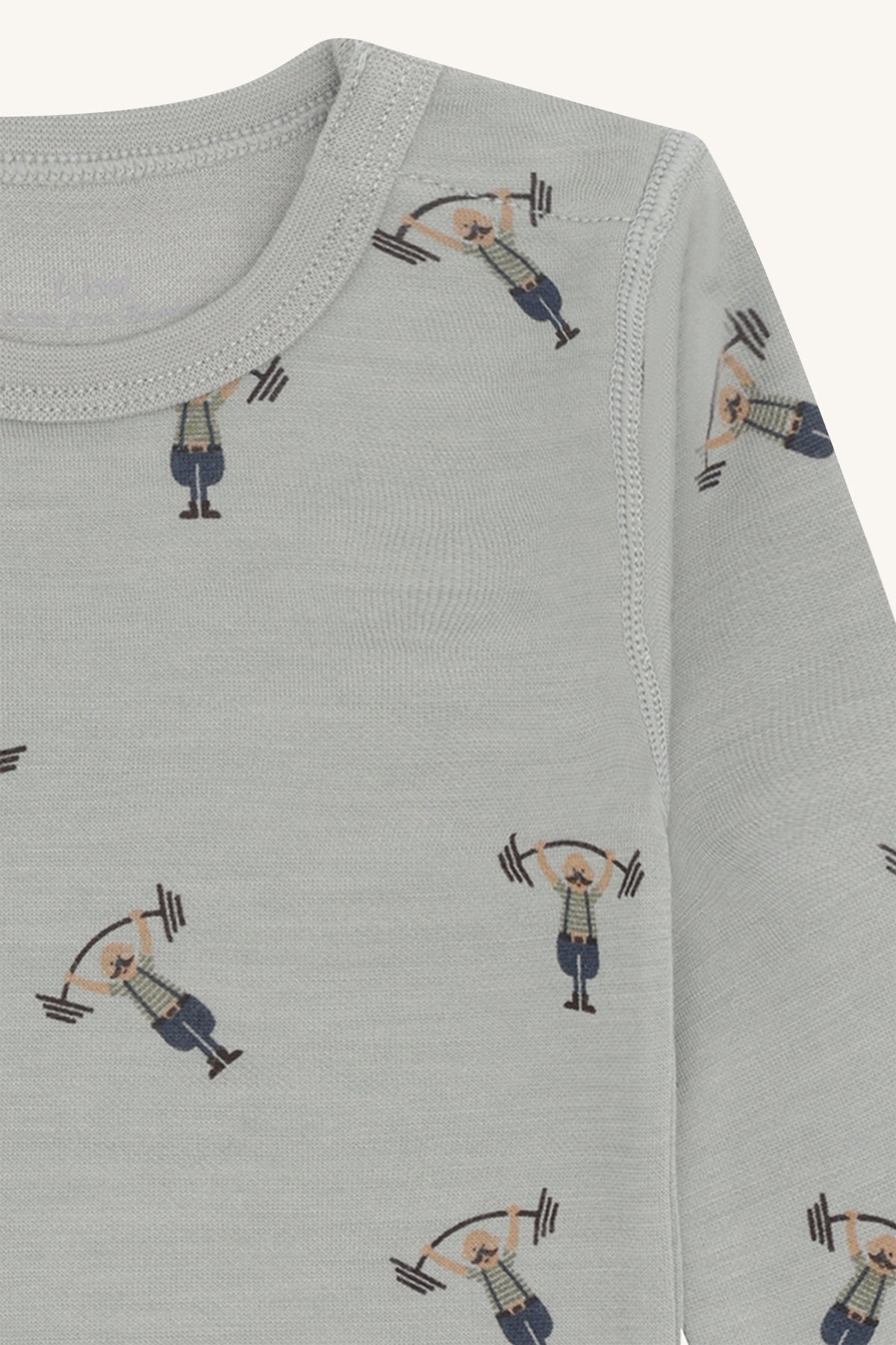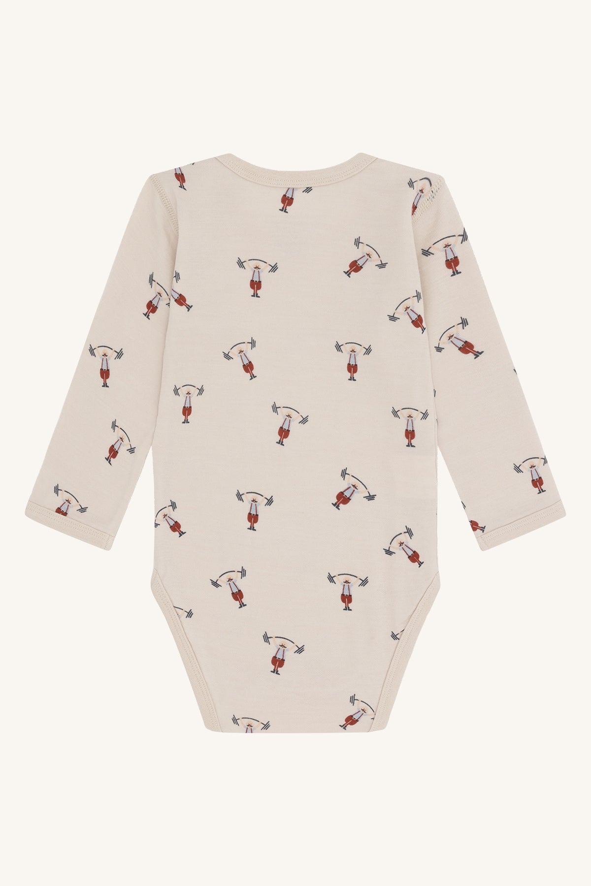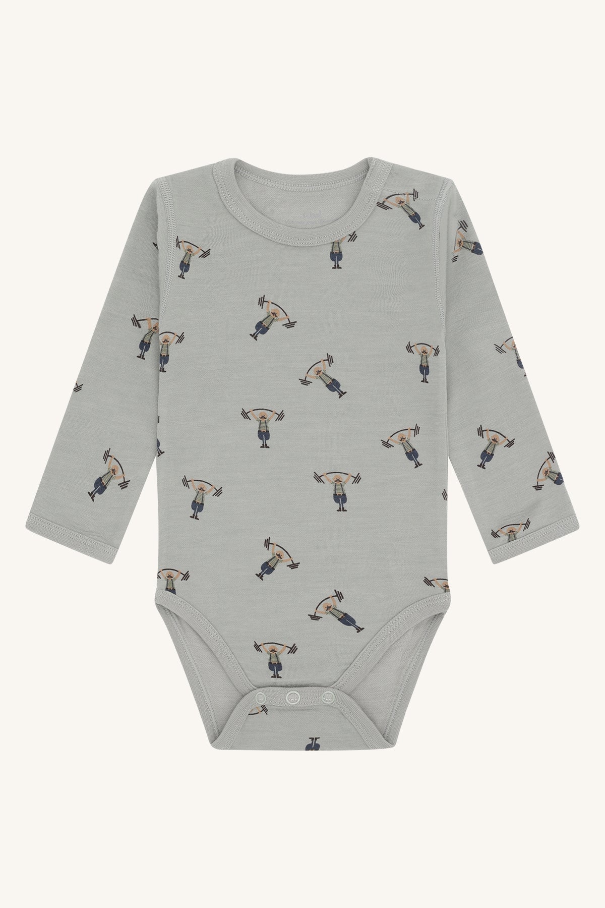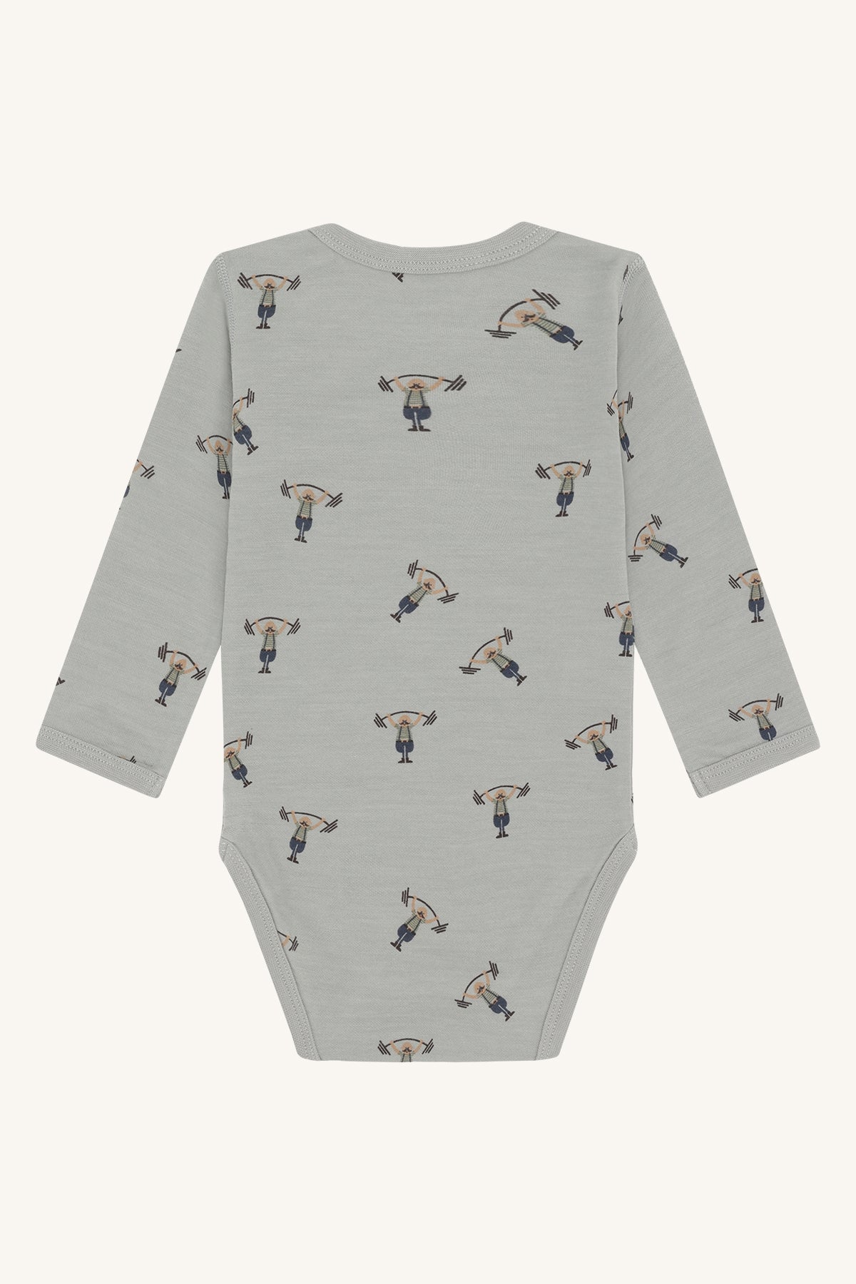 Long-sleeved body in Forest Fog or French Oak with strong man all-over print. Made from 50% wool, 5% polyamide, 45% viscose (from bamboo) for soft, stretchy comfort. Fastens on the left shoulder and between legs. Oeko-Tex 100 certified.