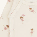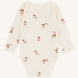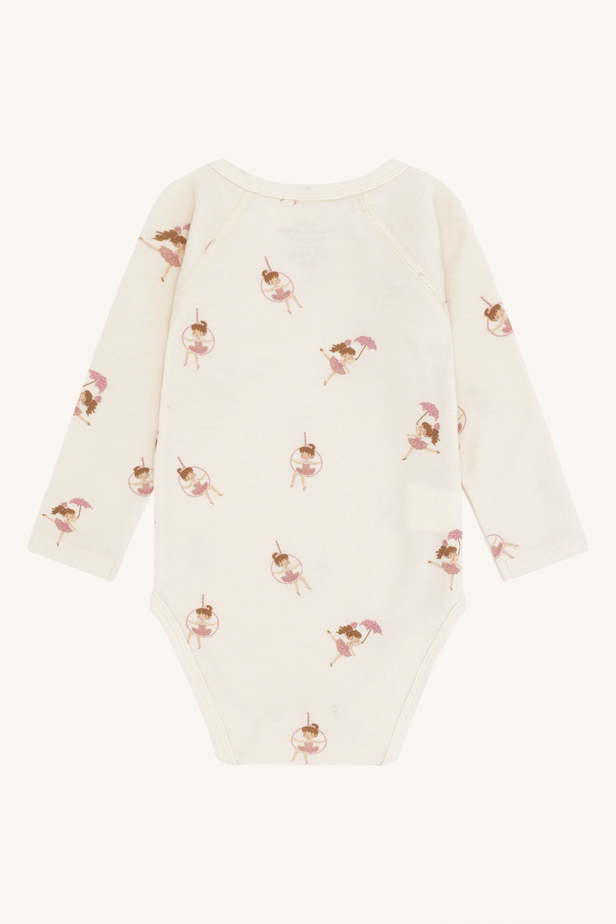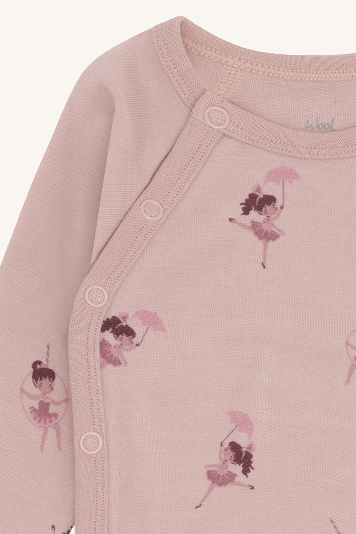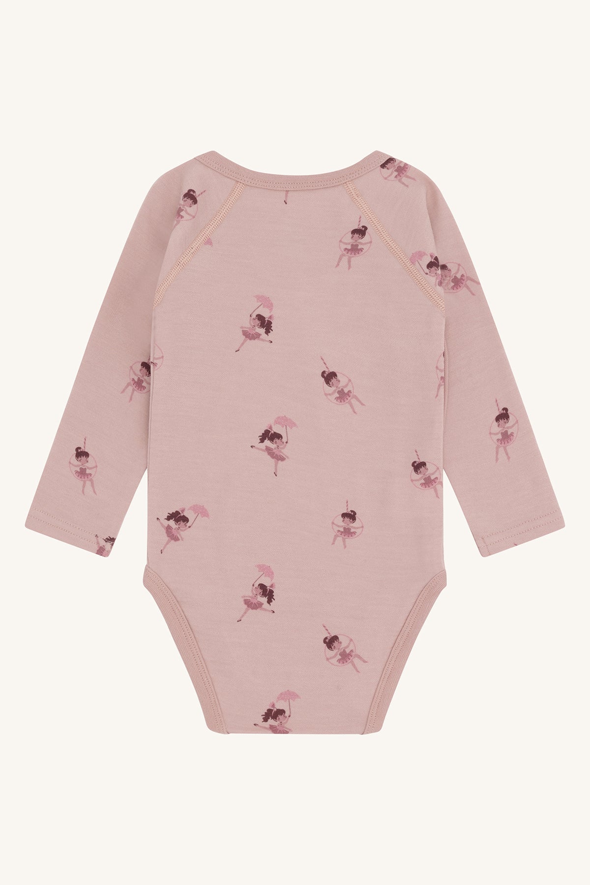 Long-sleeved bodysuit in Adobe Rose or Off White with dancer print. Made of 50% wool, 5% polyamide, 45% viscose (from bamboo), soft and stretchy. Wrap closure on right side and buttons between the legs. Oeko-Tex 100 certified.