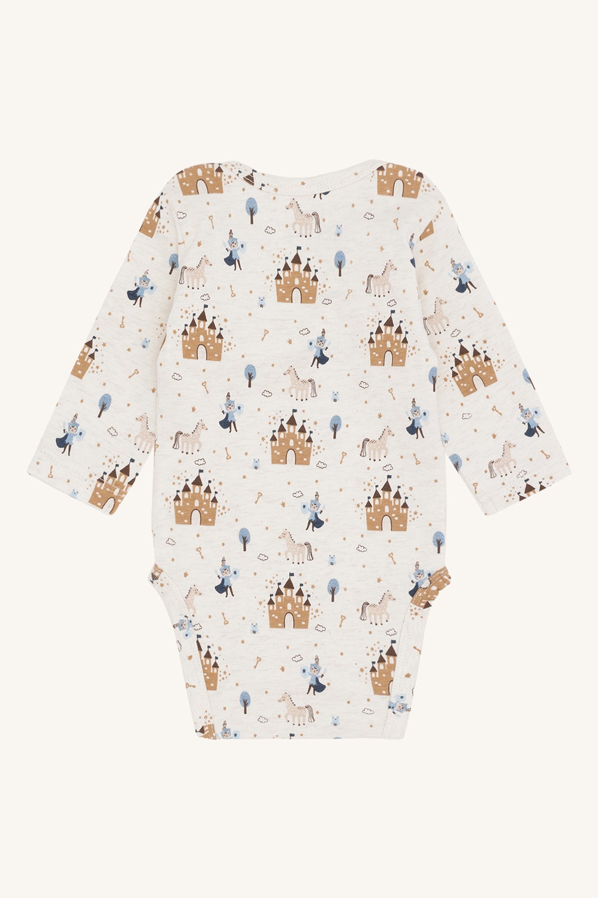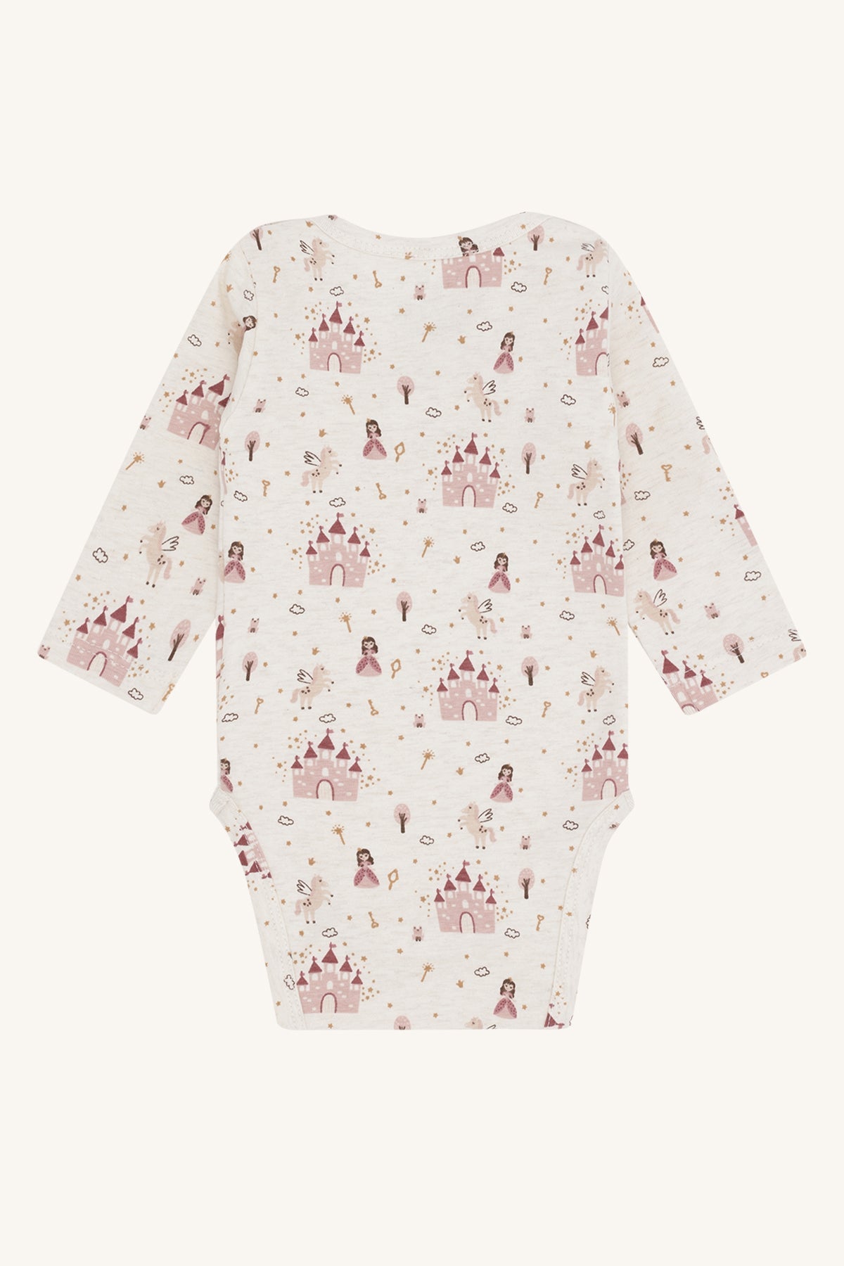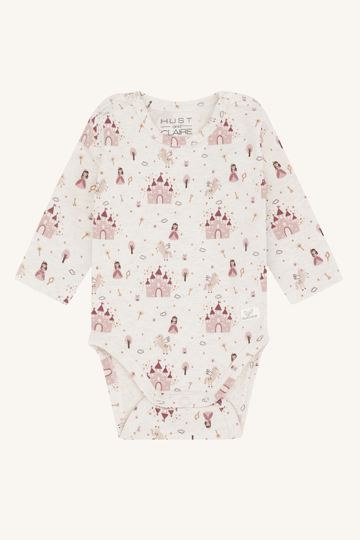 GOTS-certified long-sleeved body in Iron Blue or Adobe Rose. Made from 95% organic cotton and 5% elastane, with a whimsical fairy tale print. Features button closures on shoulders and legs for easy dressing and all-day comfort.
