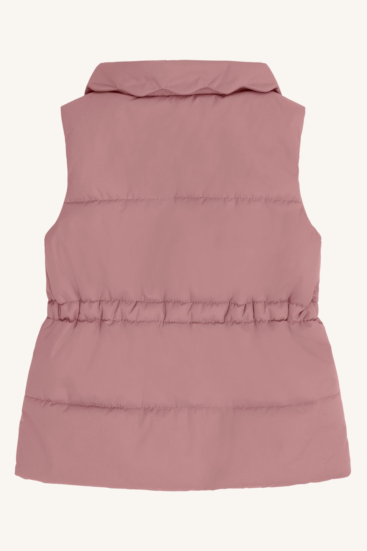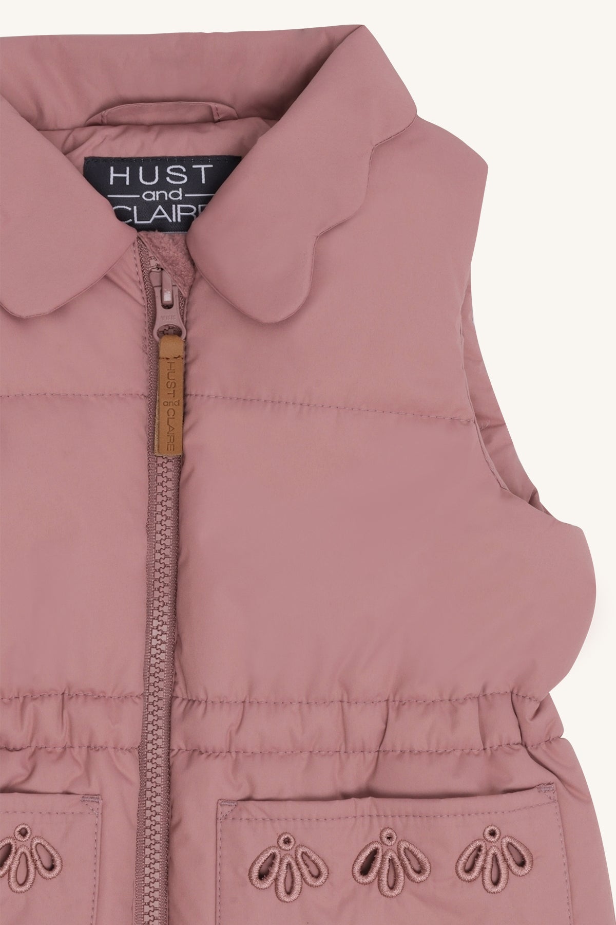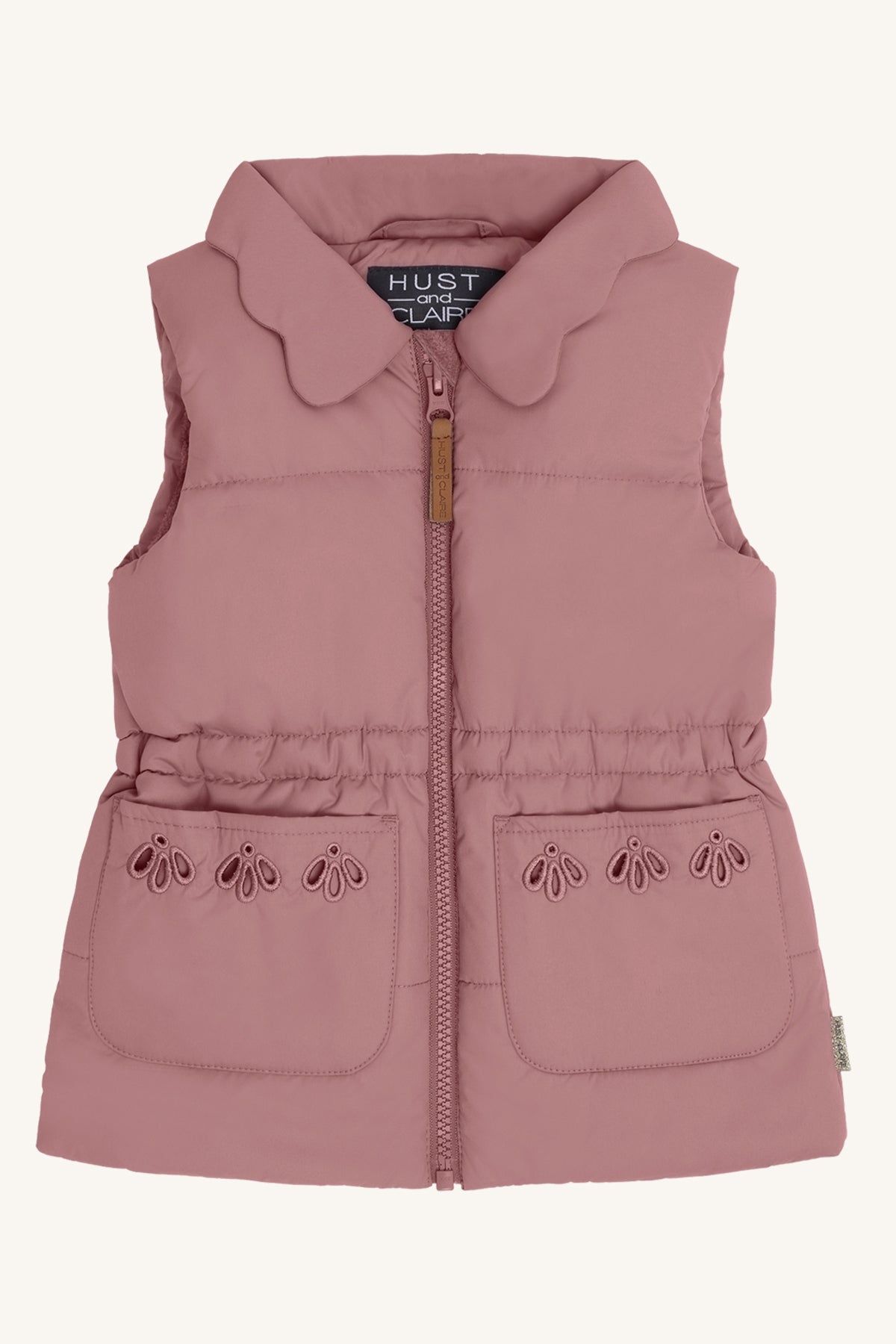 HCEmily puffer vest in pale mauve with embroidered 2 front pockets, crafted from Oeko-Tex 100 certified fabric. Lightweight yet warm, perfect for layering to keep kids cosy and stylish during cooler days. Ideal for everyday outdoor adventures.