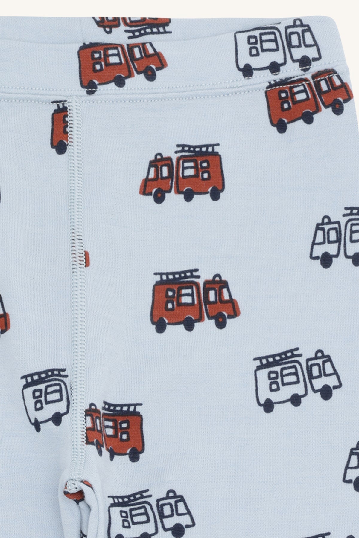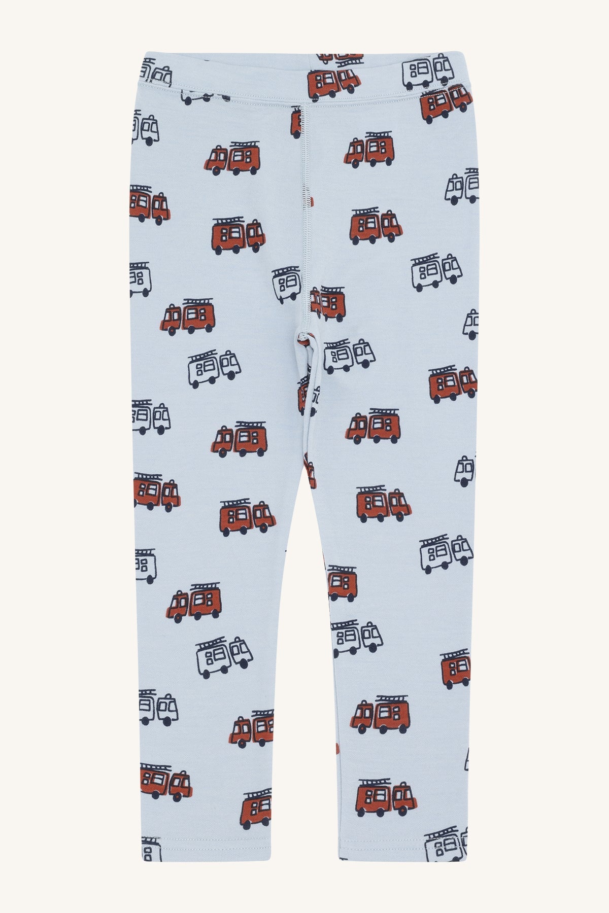 Leggings in biscuit and baby blue with fire truck print, made from 50% wool, 45% bamboo viscose, and 5% polyamide. Certified Oeko-Tex 100, featuring a soft stretch fabric, elastic waistband, wool outside, and bamboo viscose lining for warmth and comfort.