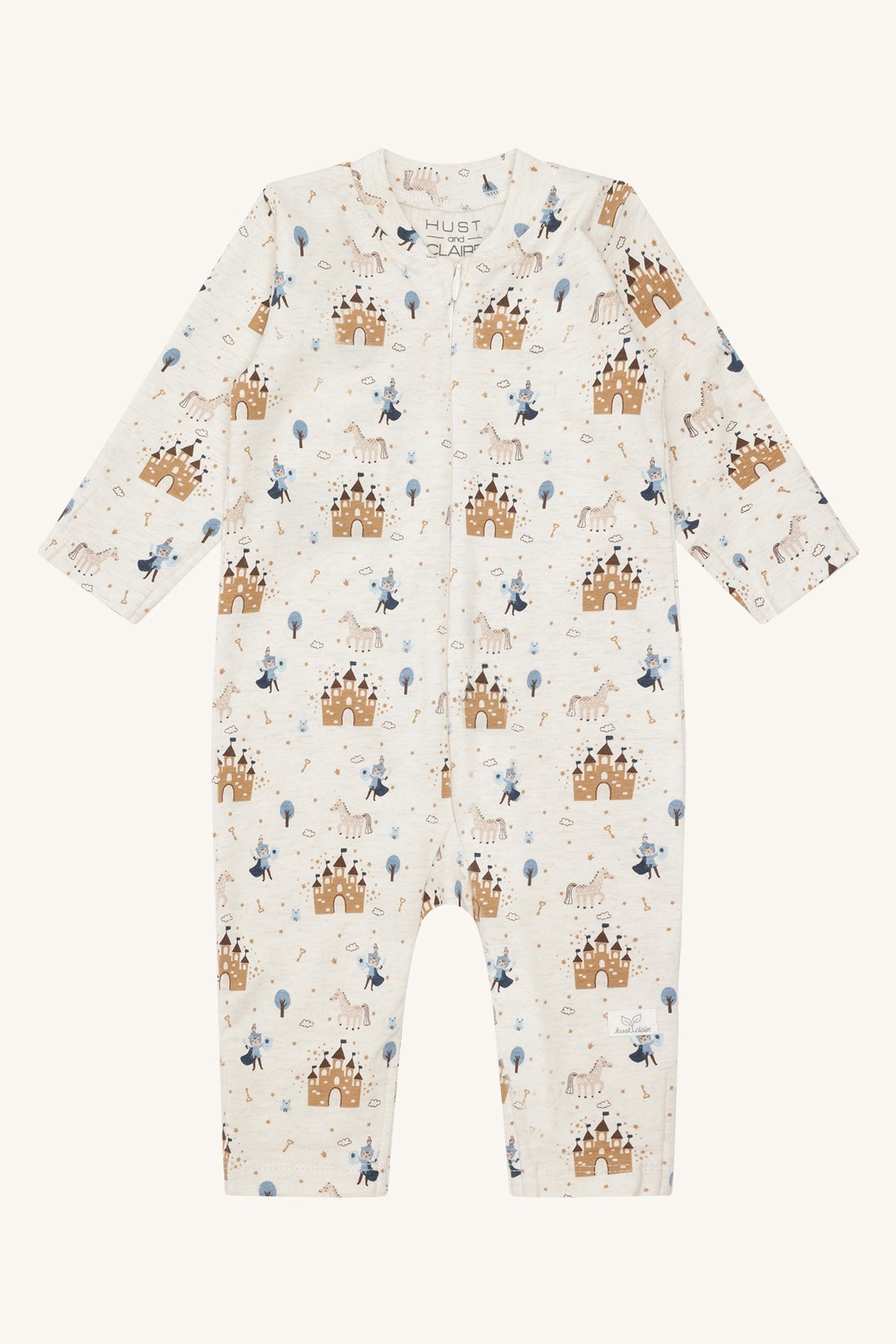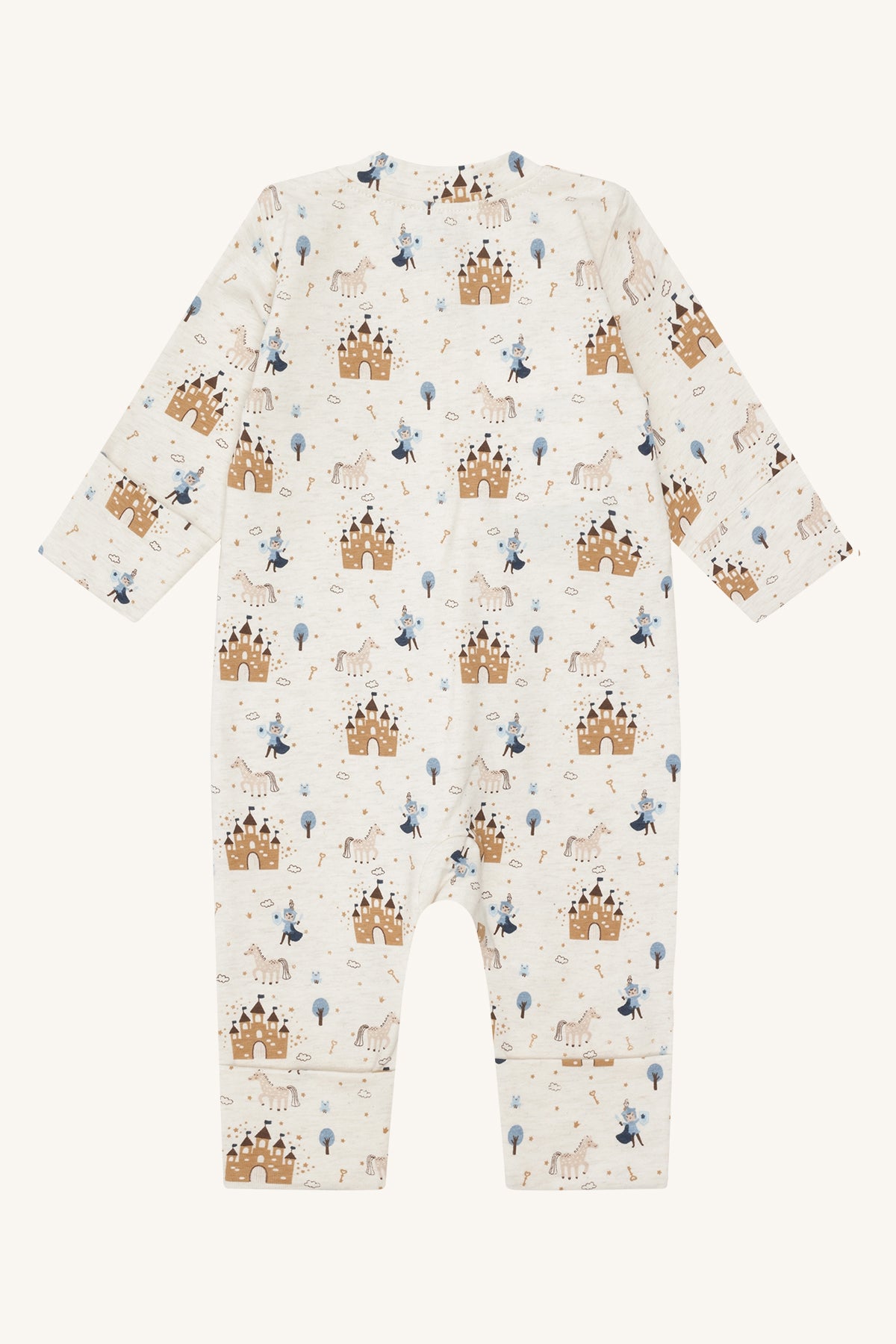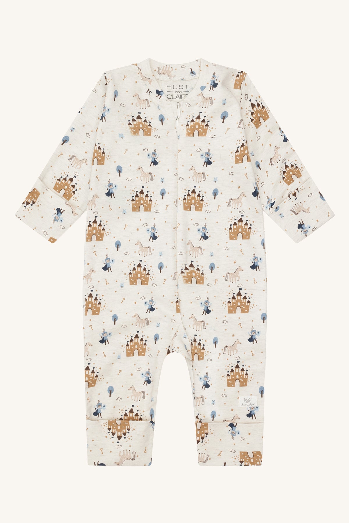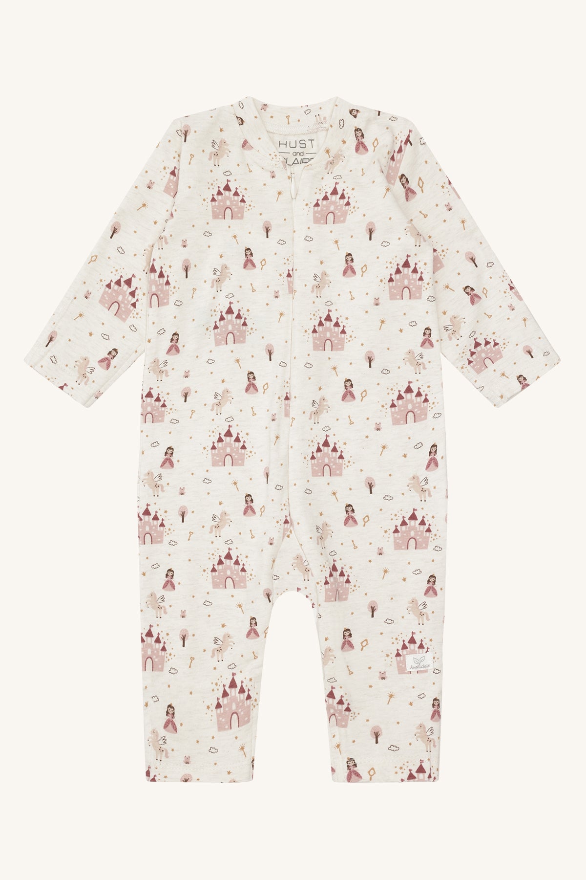 GOTS-certified sleepsuit in Baby Blue or Adobe Rose, made from 95% organic cotton and 5% elastane. Features a fairy tale print, asymmetrical zip, and fold-over sleeves and legs for extra warmth or use as socks.