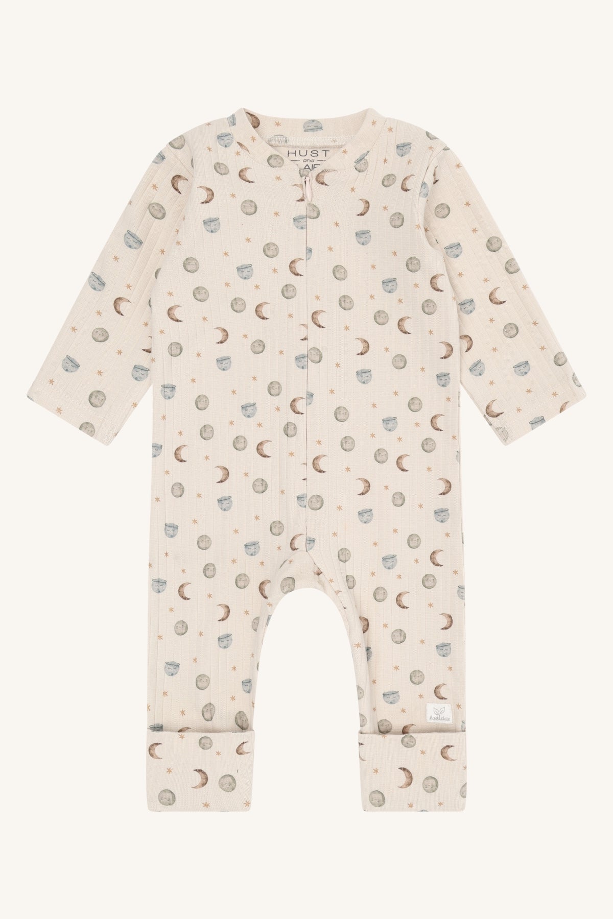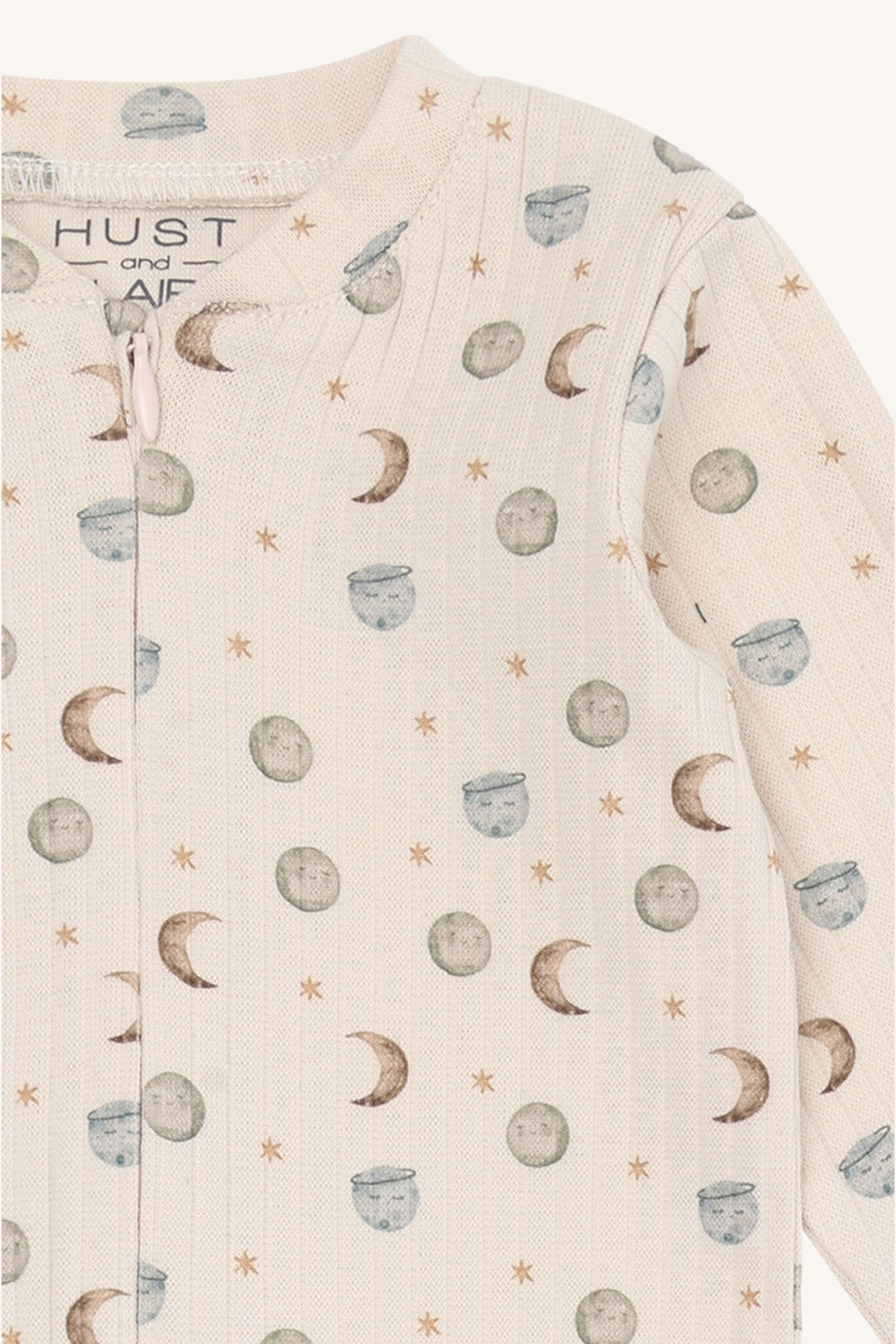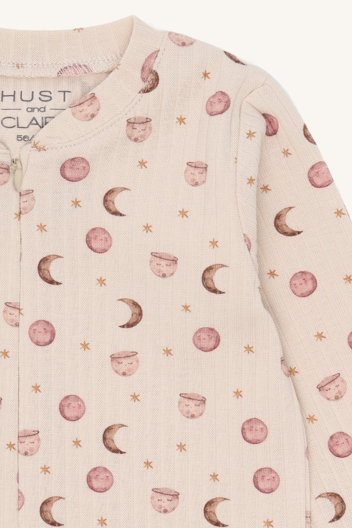 GOTS-certified sleepsuit in Gray Morn or French Oak, made from 95% organic cotton and 5% elastane. Features an all-over moon print, ribbed texture, central zip, and foldable leg edges that convert into cosy socks.