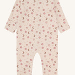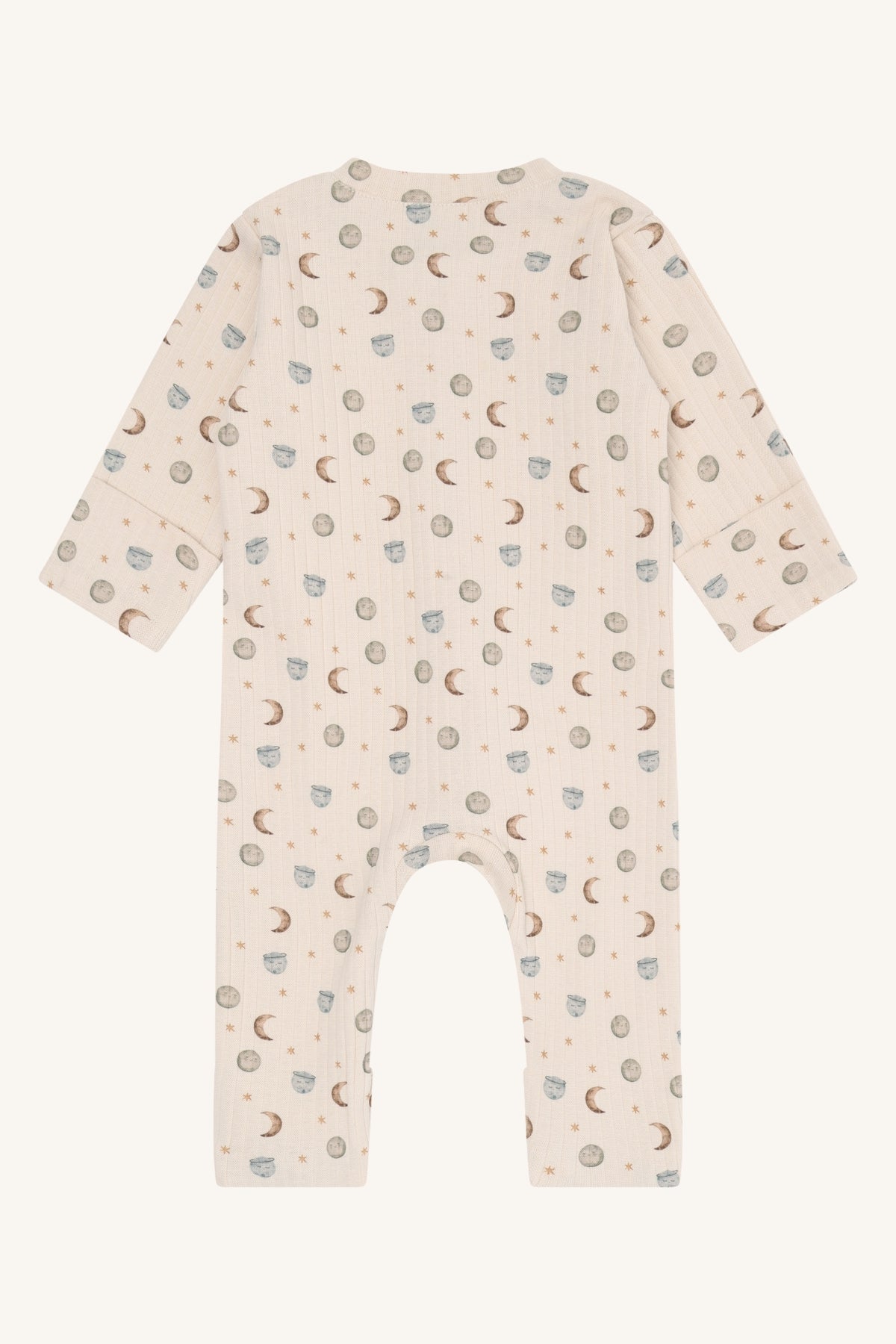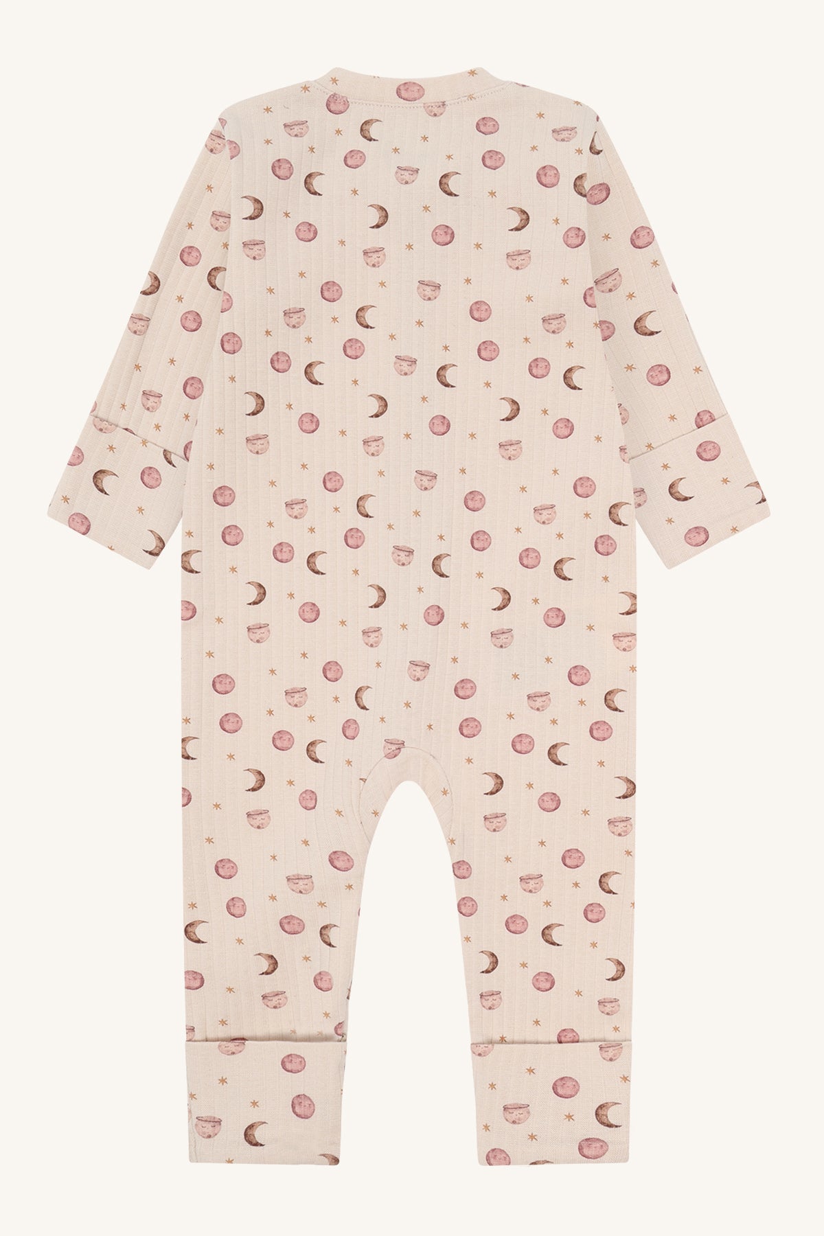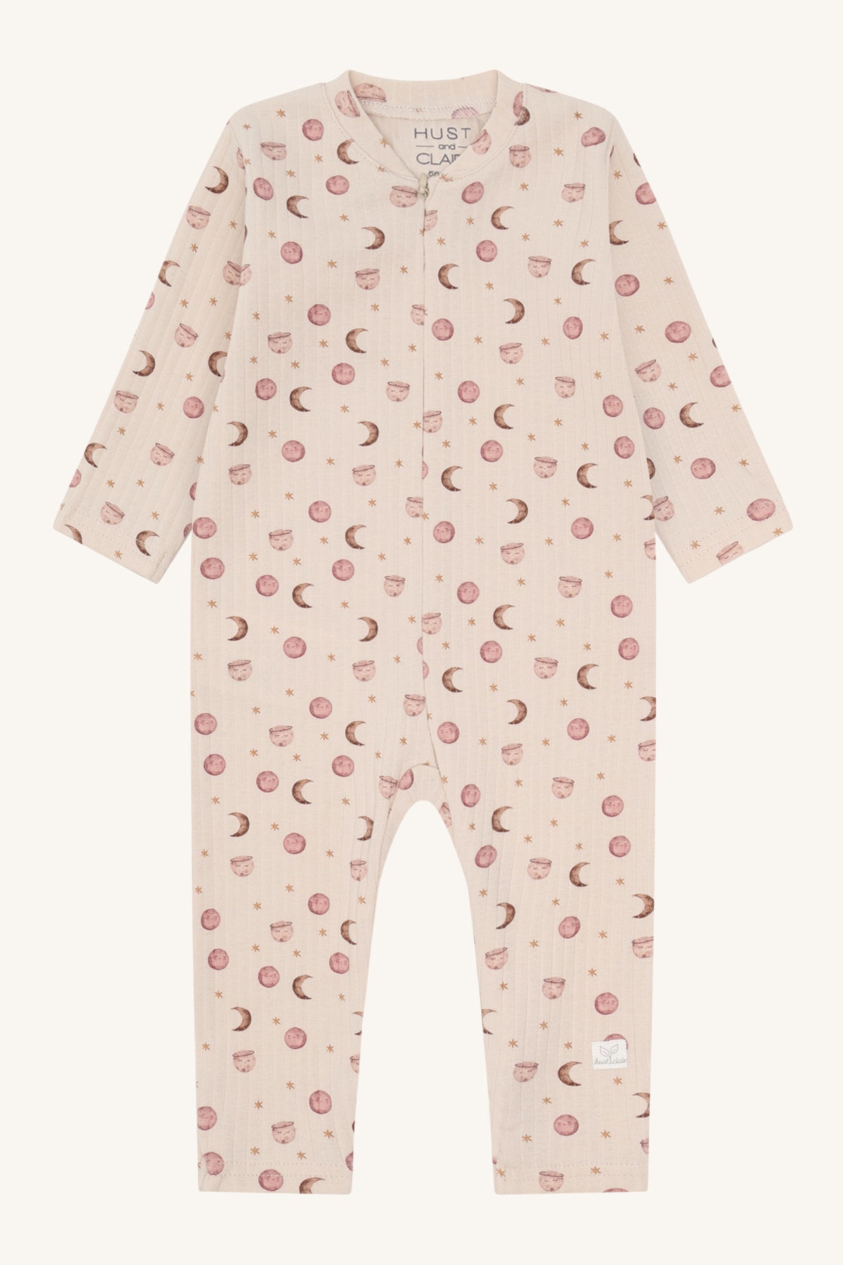 GOTS-certified sleepsuit in Gray Morn or French Oak, made from 95% organic cotton and 5% elastane. Features an all-over moon print, ribbed texture, central zip, and foldable leg edges that convert into cosy socks.