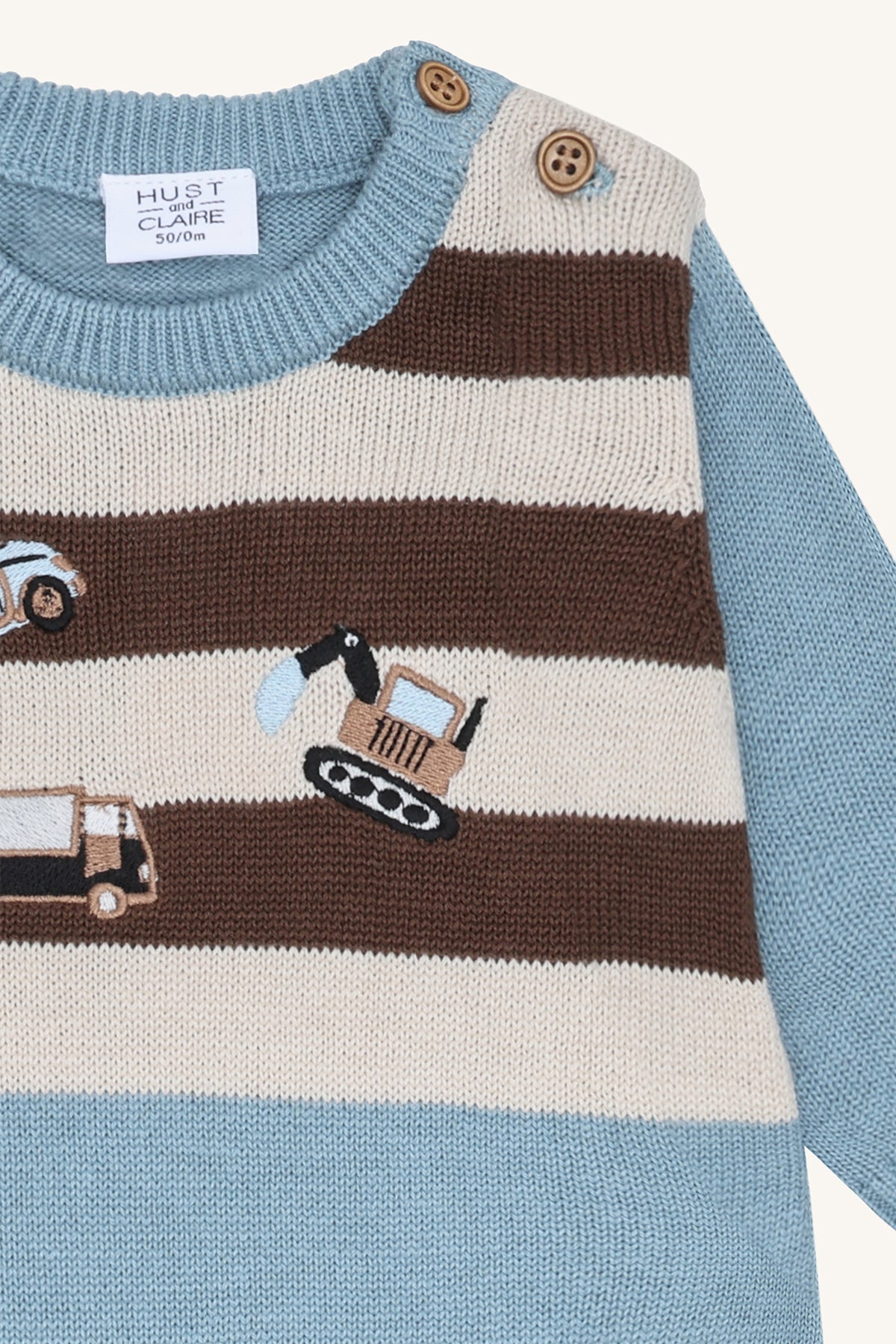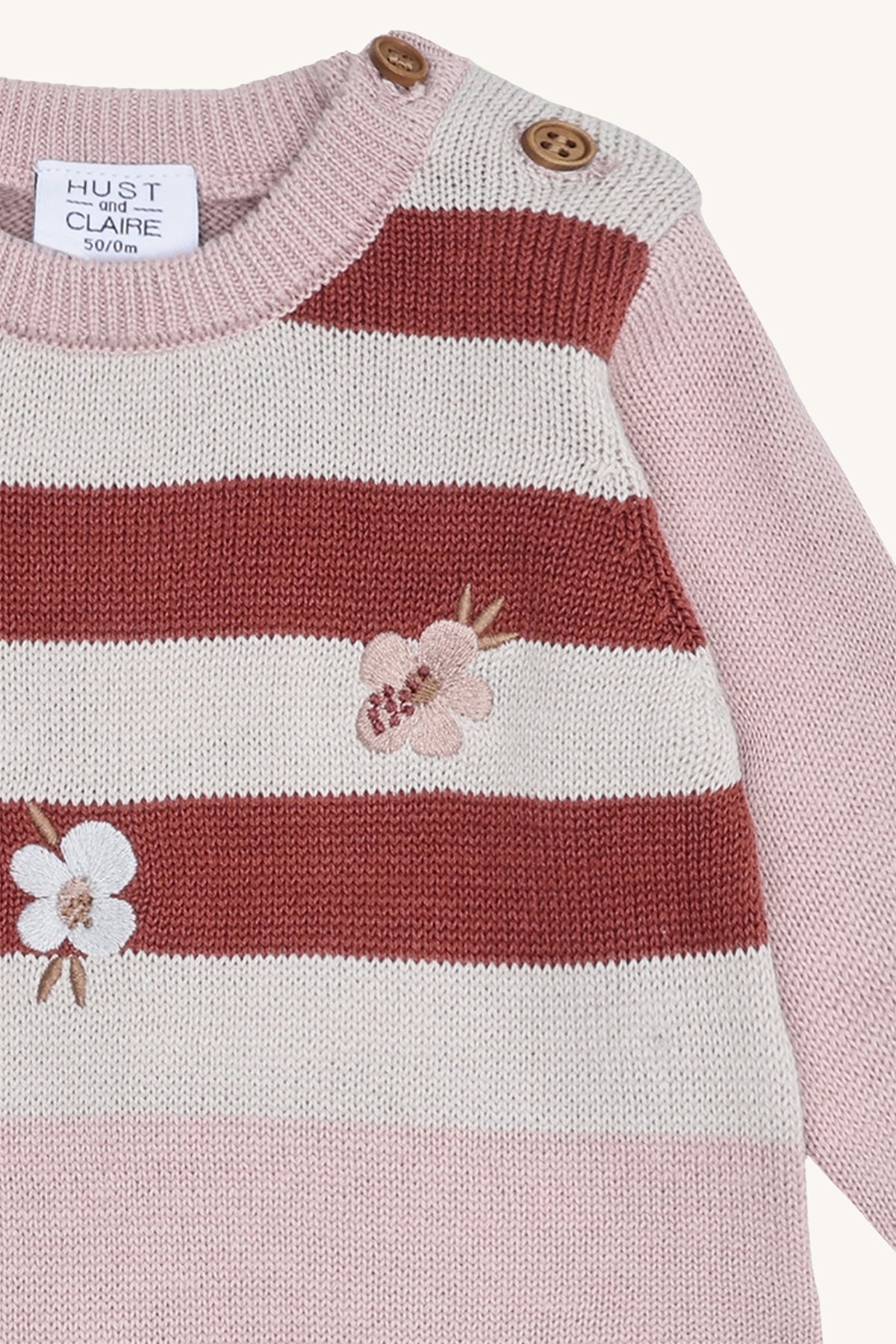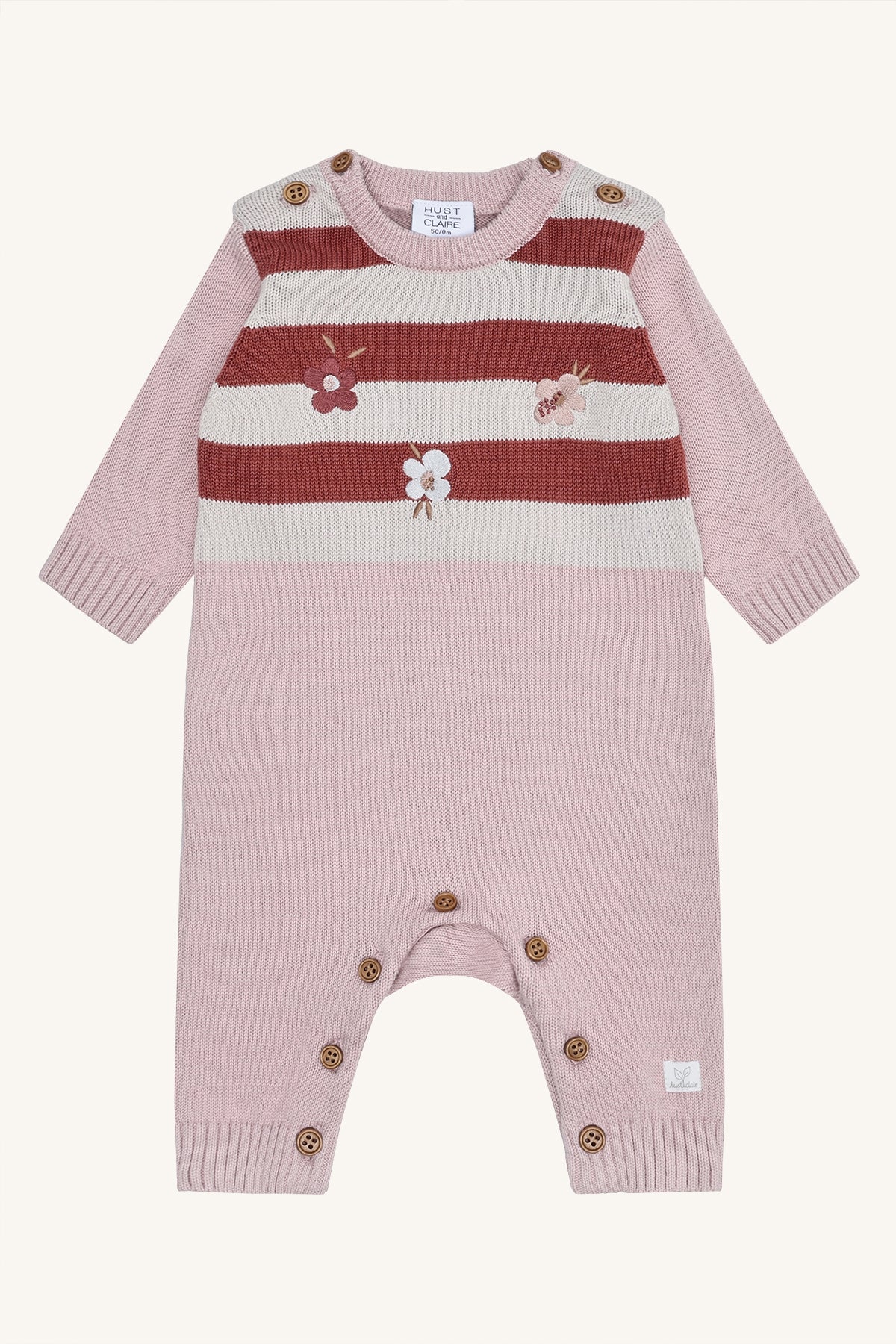 Adorable organic cotton knit romper in Iron Blue or Adobe Rose. Features charming stripes, embroidered flowers or vehicles, and practical button closures on shoulders and legs. Soft, breathable, and perfect for stylish everyday comfort. 100% organic cotton.