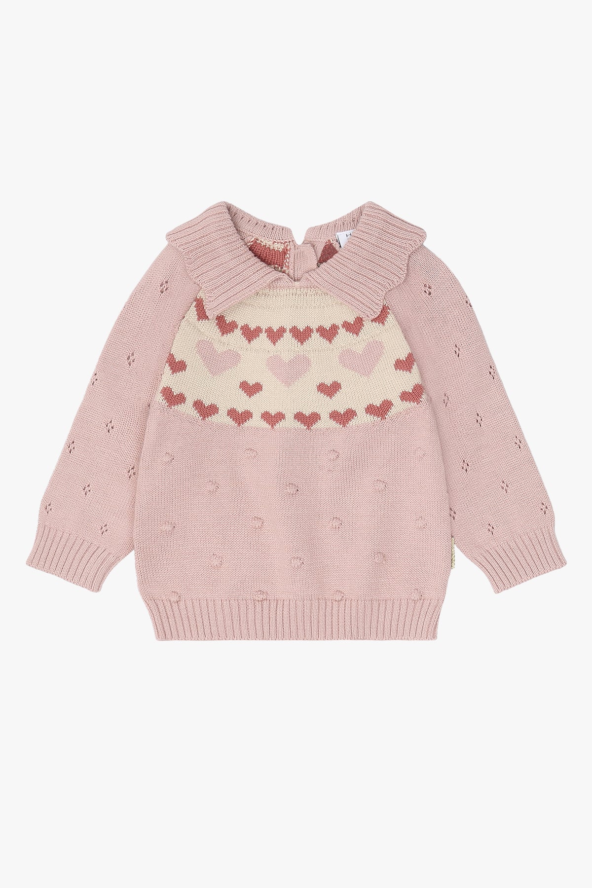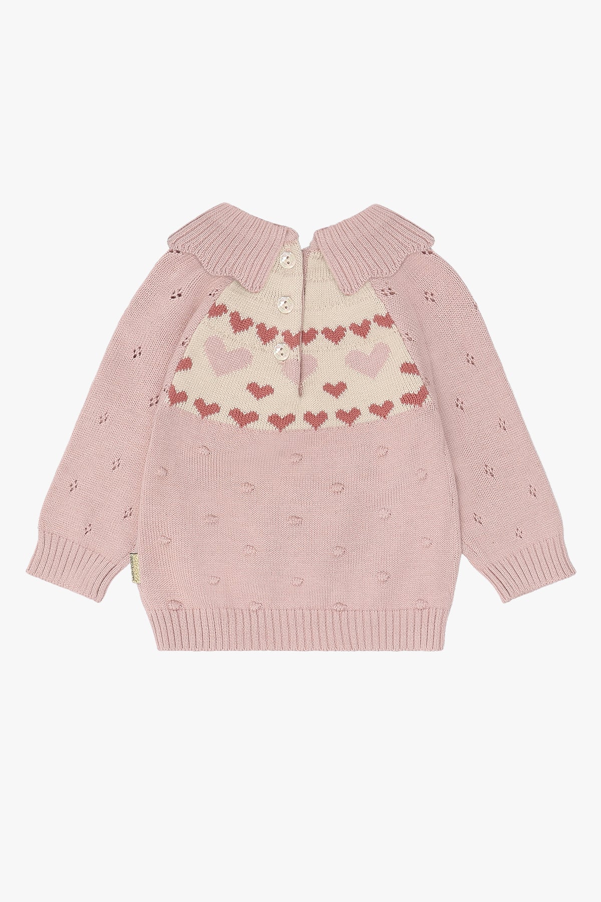 Knit pullover in Adobe Rose, crafted from organic cotton for a soft, cosy feel. Features a charming Peter Pan collar, heart design, delicate sleeve eyelets, and back buttons for easy dressing, perfect for stylish and comfortable everyday wear.