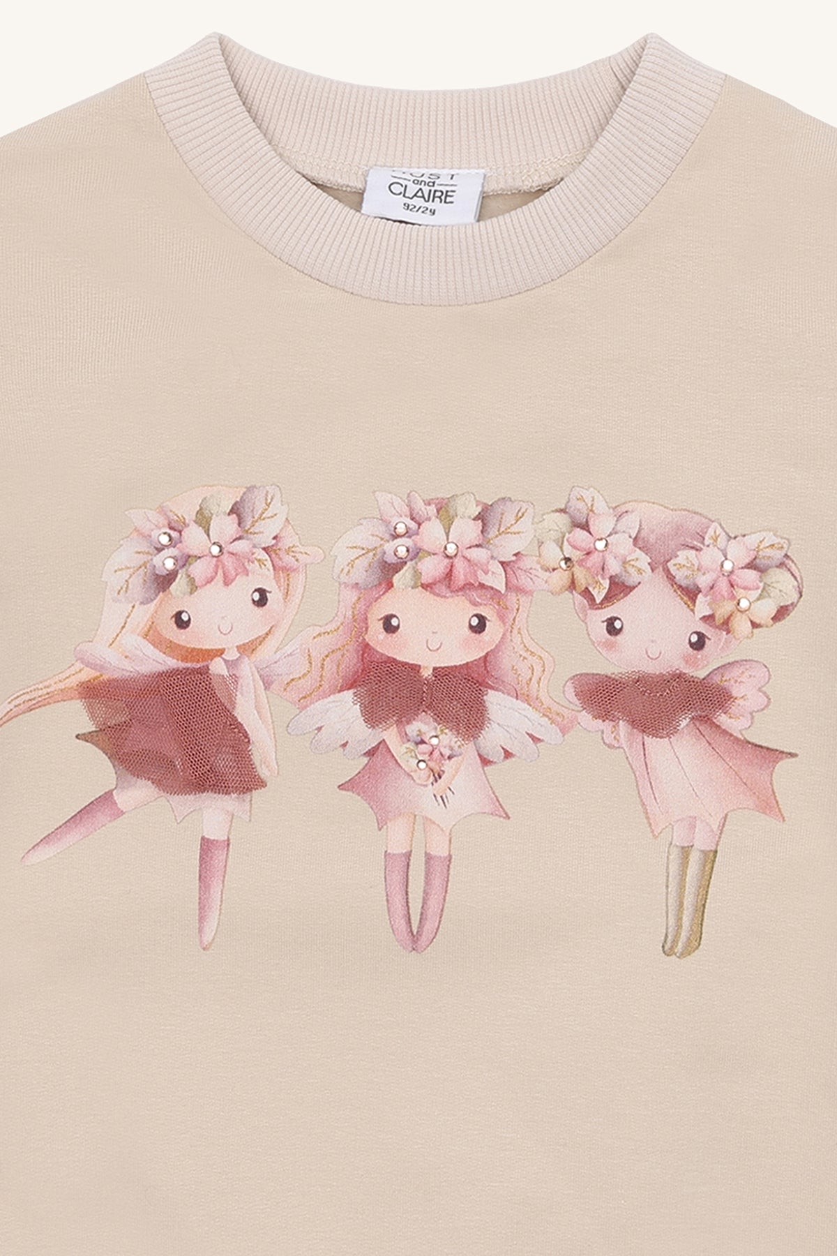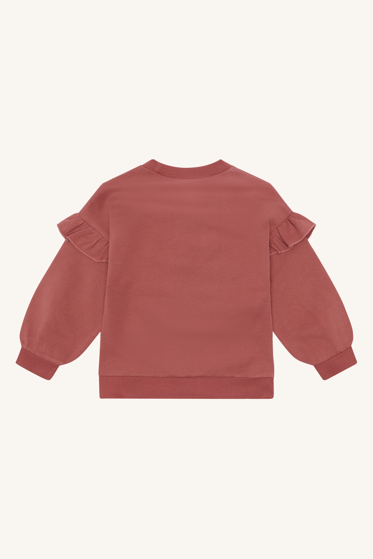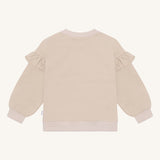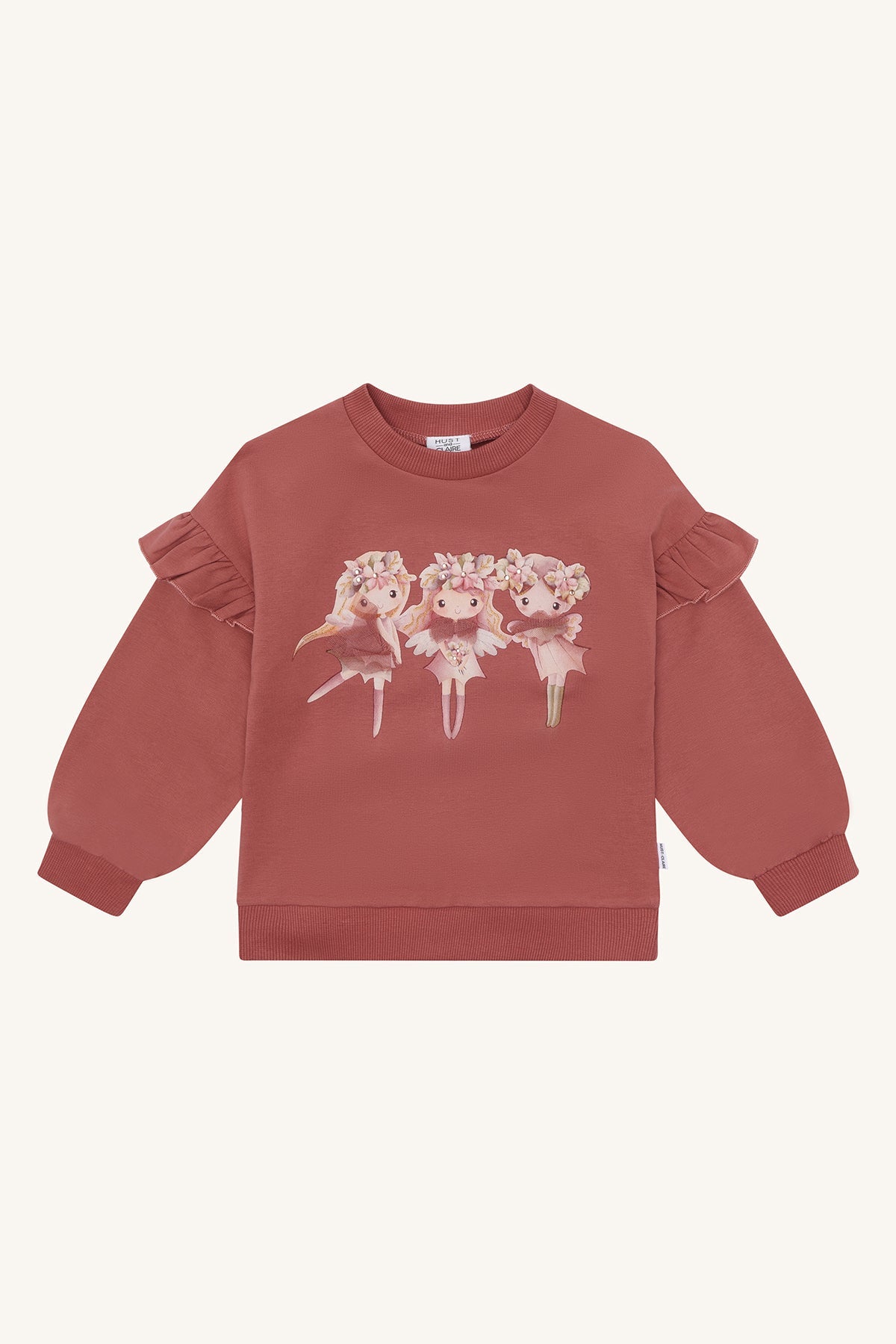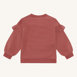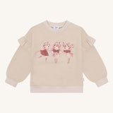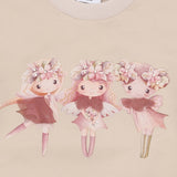 Dry rose and french oak sweatshirt made from 97% organic cotton and 3% elastane. Features three ballerinas on the front with delicate ruffles on the sleeves, combining soft comfort and playful style, perfect for your child’s everyday adventures.