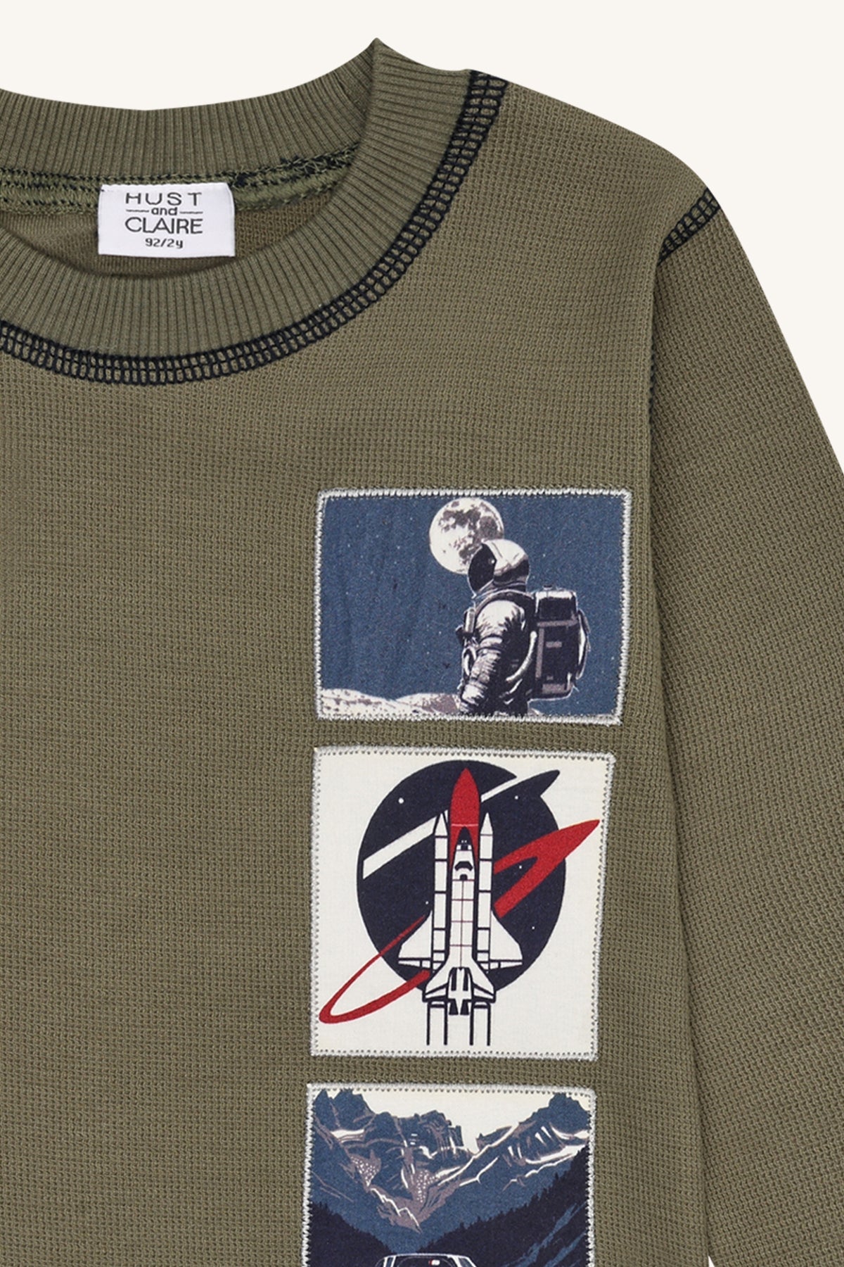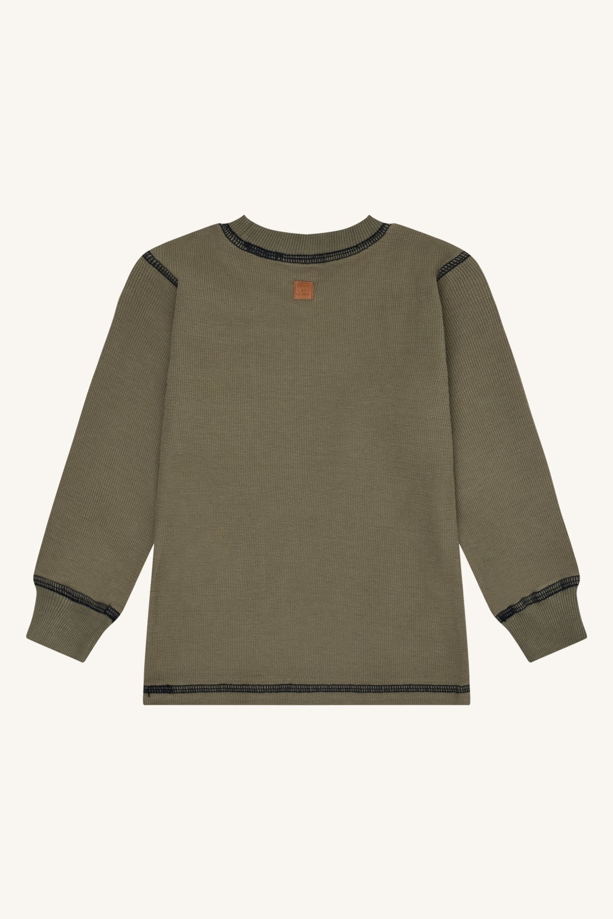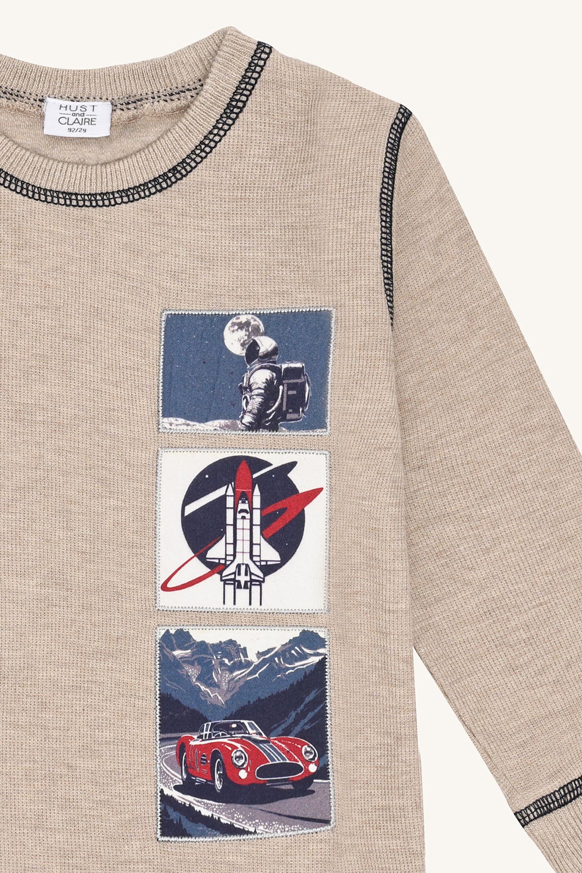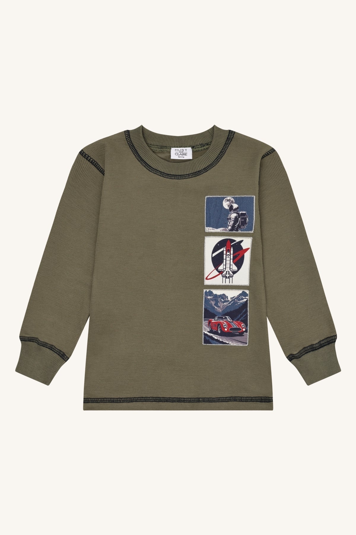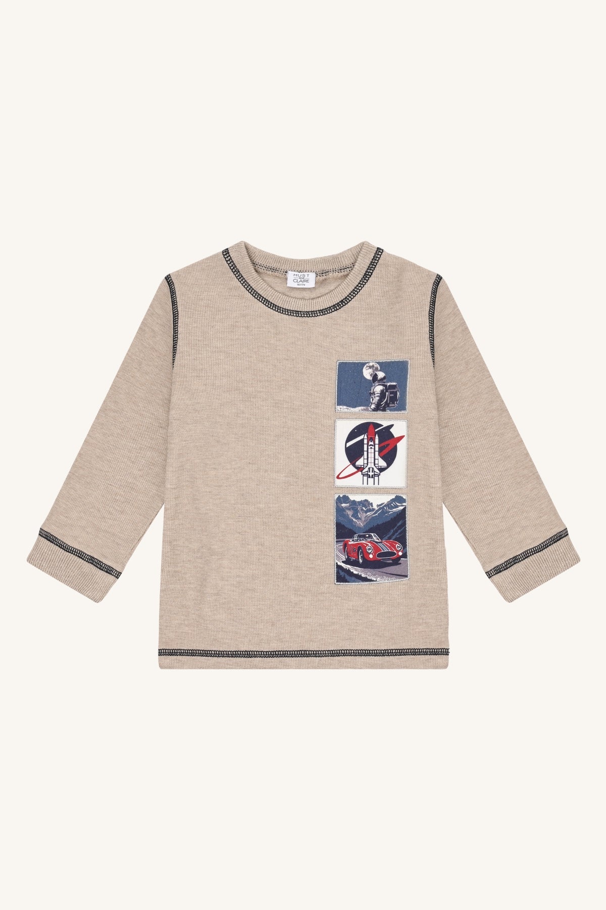 Long-sleeved t-shirt in biscuit and turtle, made from 95% organic cotton and 5% elastane. Features a playful rocket design for added fun, combining comfort, stretch, and eco-friendly materials, perfect for your child’s everyday adventures.