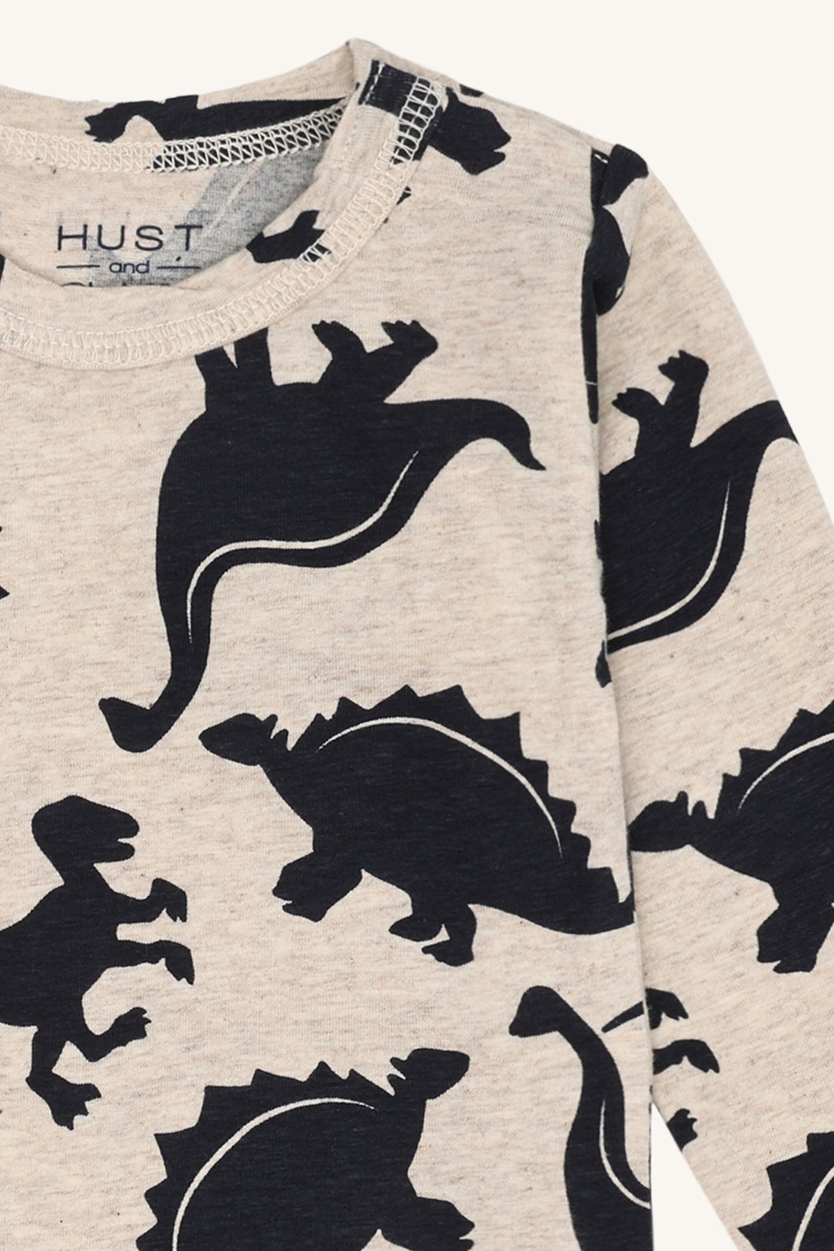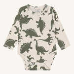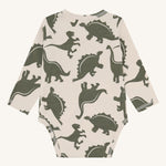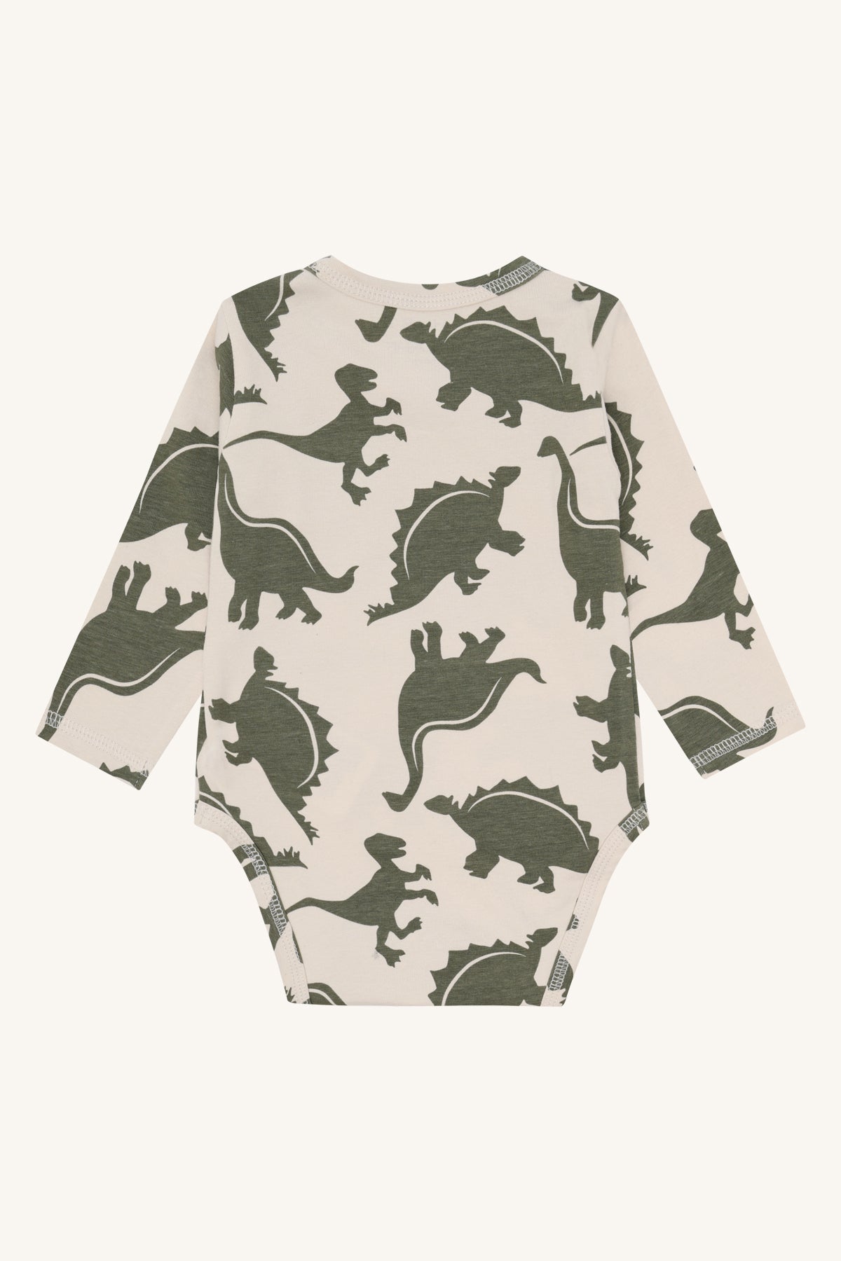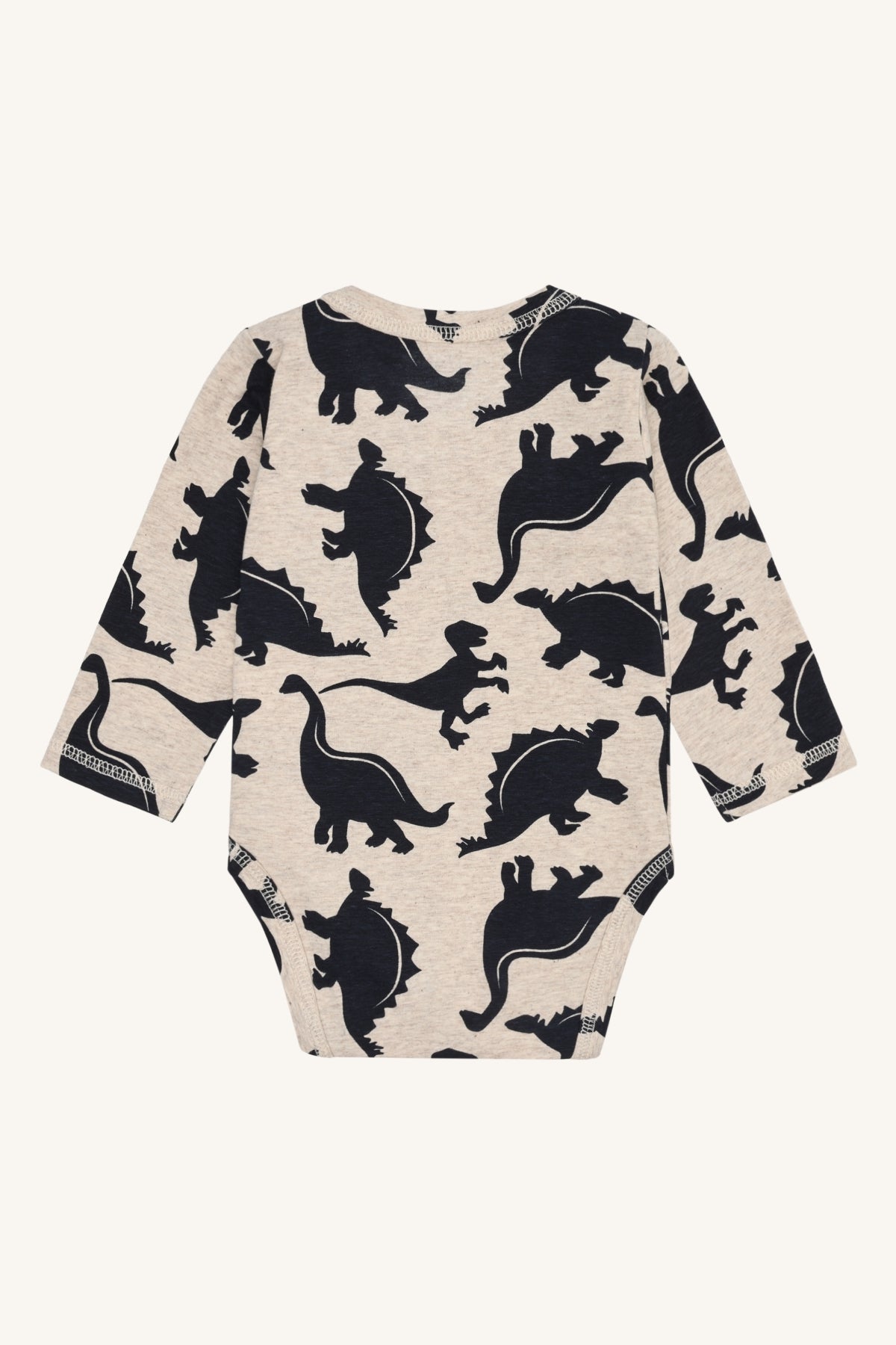 Long-sleeved body in Biscuit and French Oak, made from 95% cotton and 5% elastane. Features a playful dinosaur all-over print, ensuring comfort and stretch for active children. Perfect for everyday wear with easy movement and soft fabric.