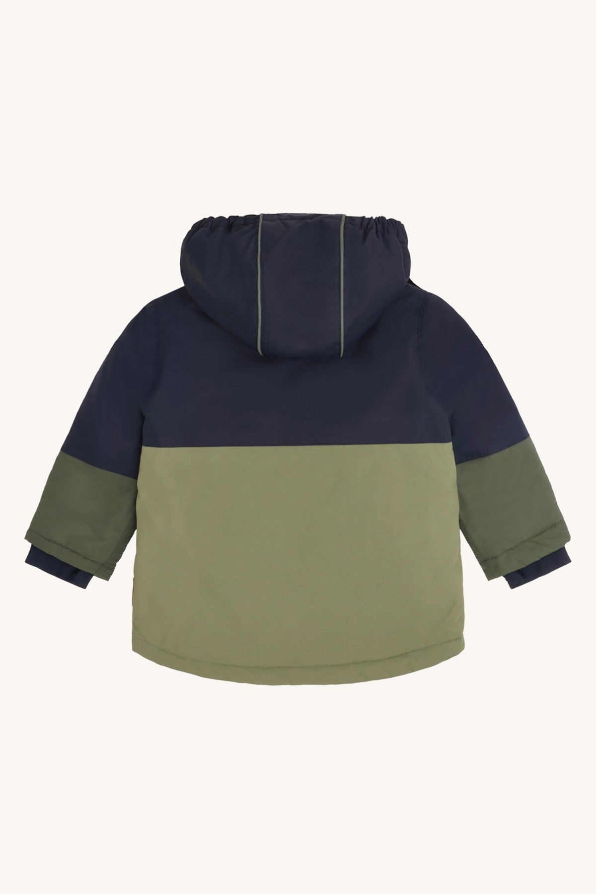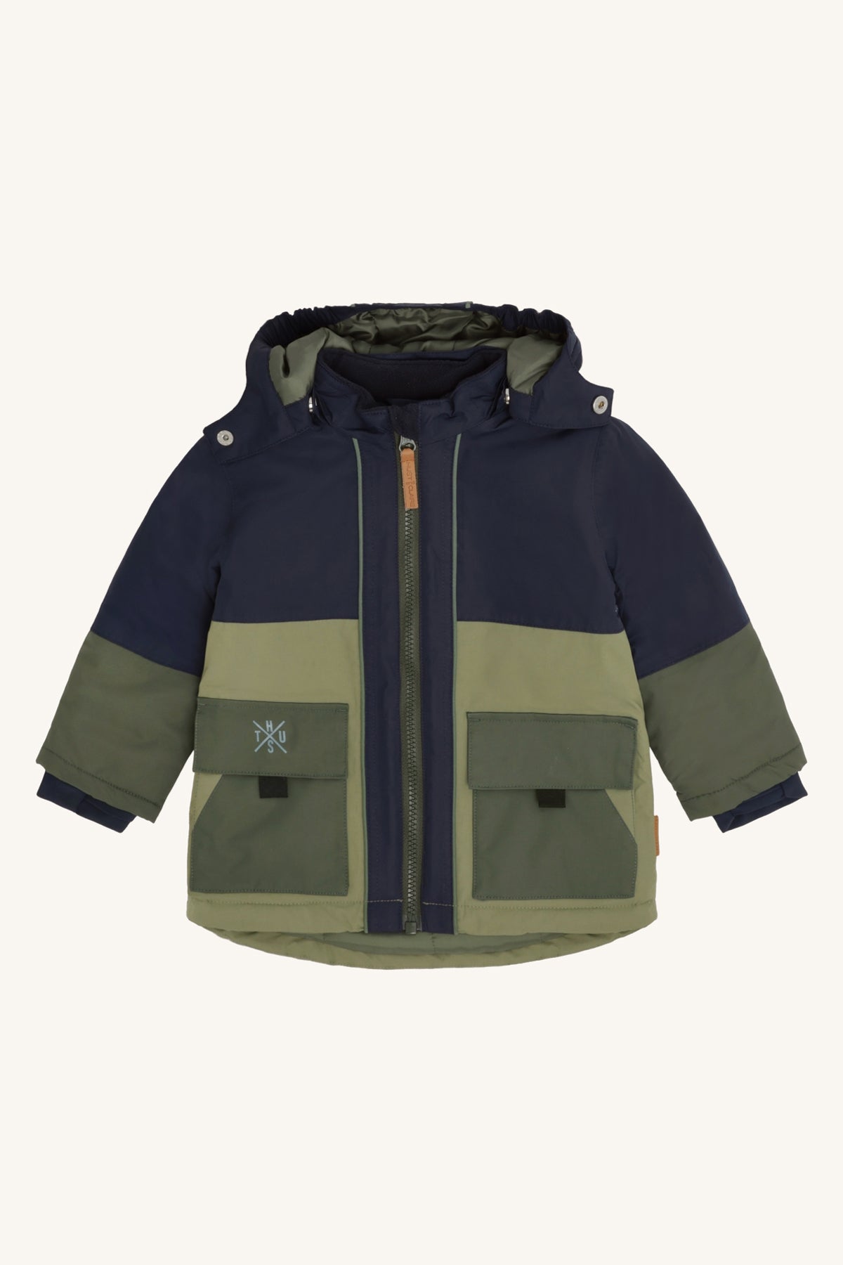 Fully lined winter jacket with detachable hood and front pockets. The jacket features a snow skirt with a small thumb hole and reflective ribbed edges on the hood and shoulders. It closes at the front with a zipper and can be tightened at the bottom with a drawstring.