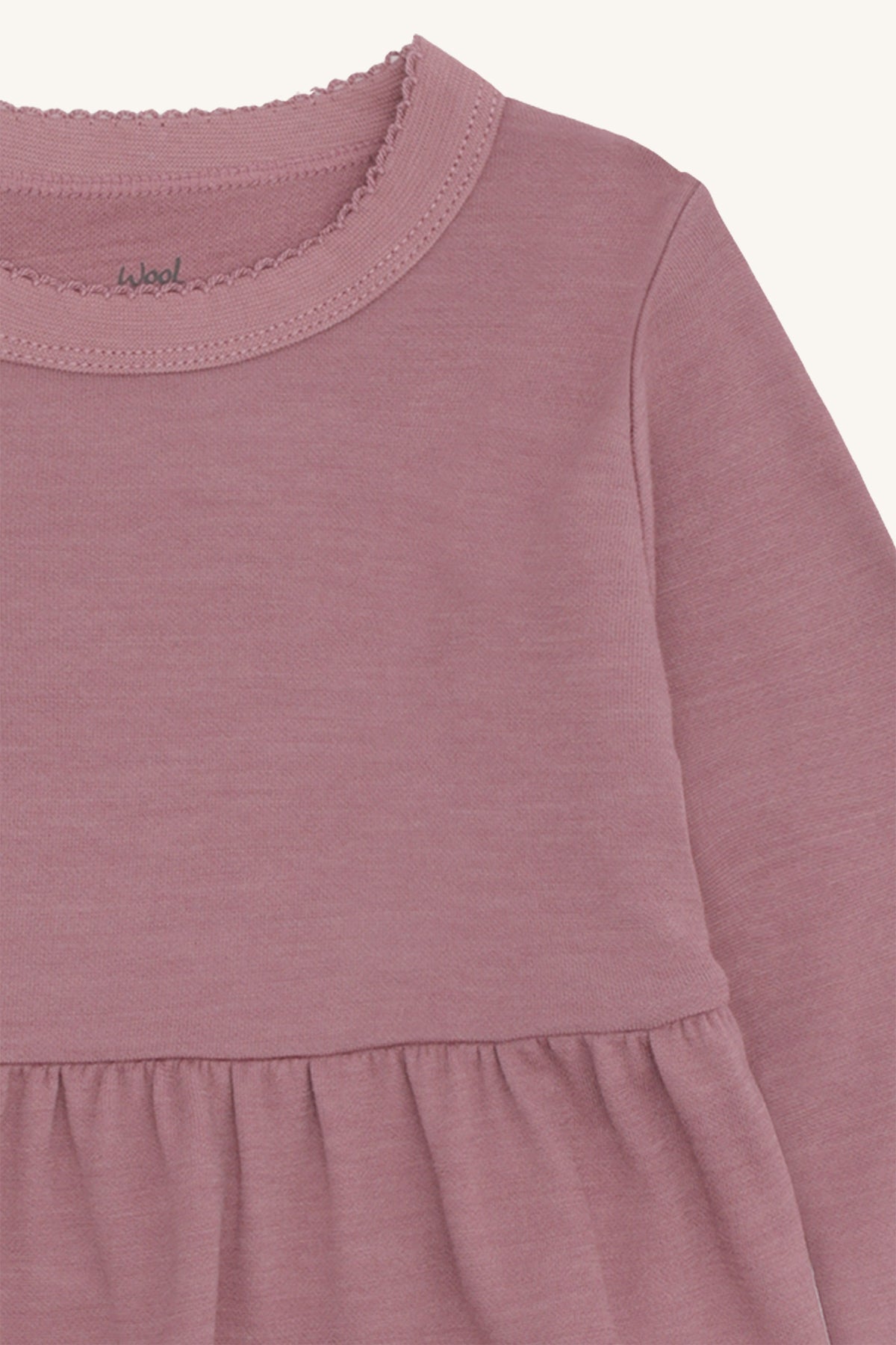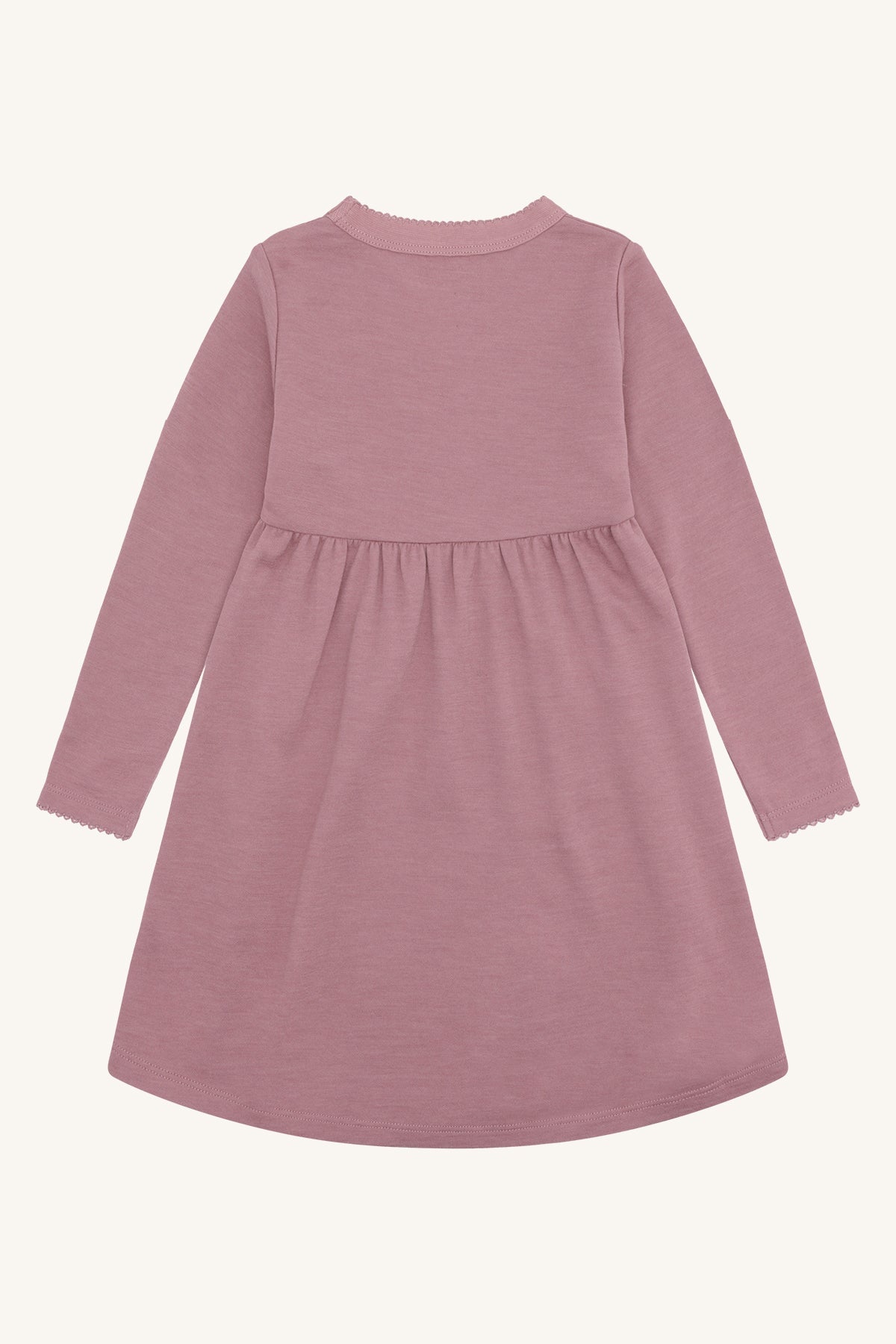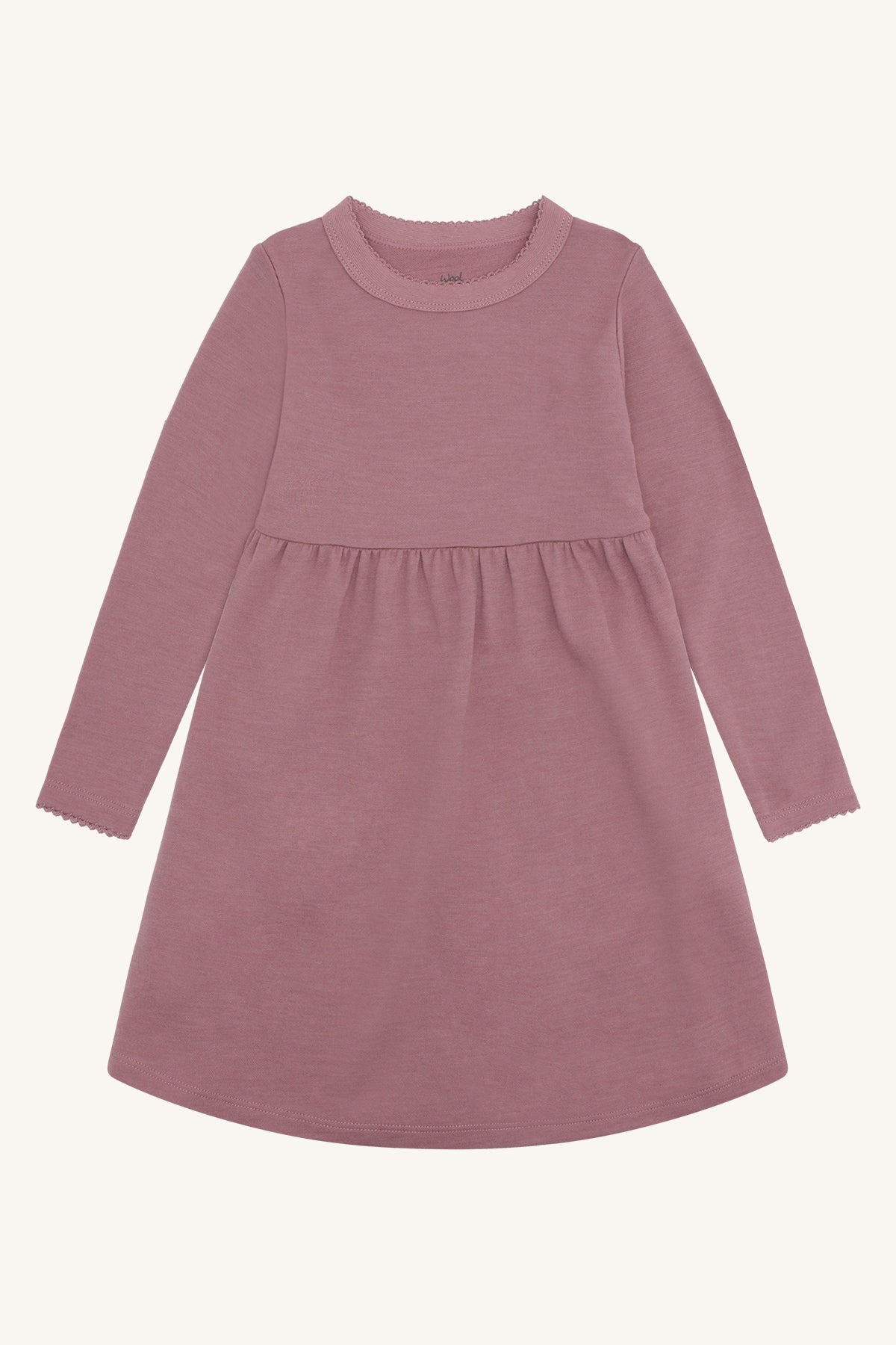 Pale Mauve long-sleeved dress made from 50% wool, 45% bamboo viscose, and 5% polyamide, certified Oeko-Tex 100. Soft, warm, and breathable—perfect for keeping your child cosy and stylish during cooler days.