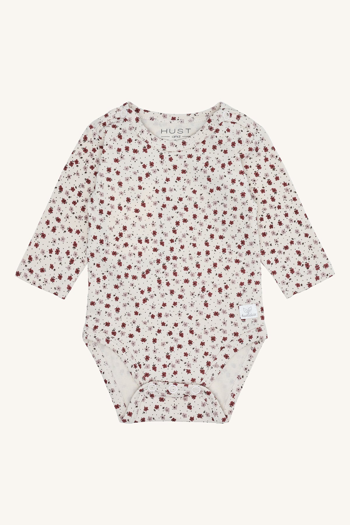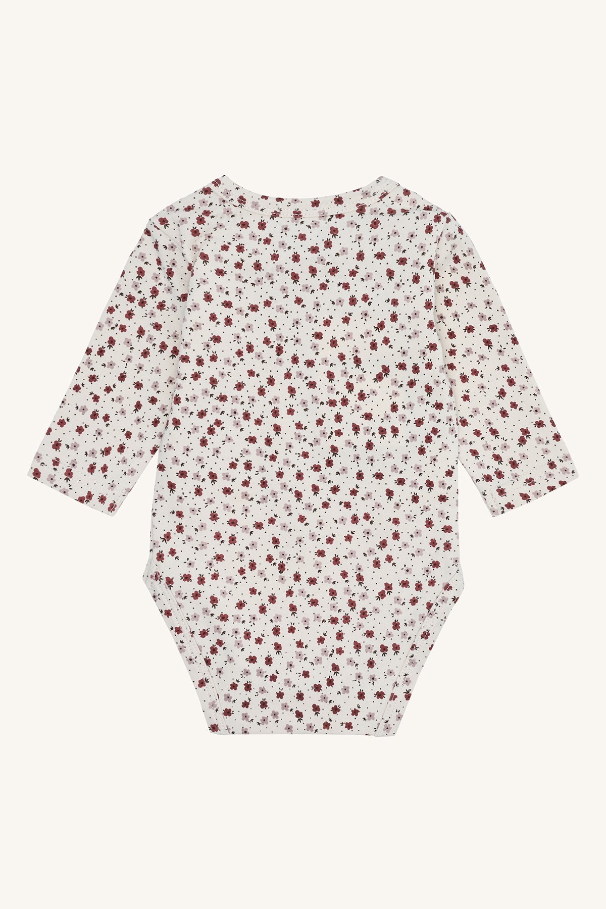 Long-sleeved body in Grey Morn with floral print or Baby Blue with car print. Main fabric: 95% cotton, 5% elastane. Buttons at the shoulders and between the legs for easy changing. Soft, stretchy, and gentle on skin.