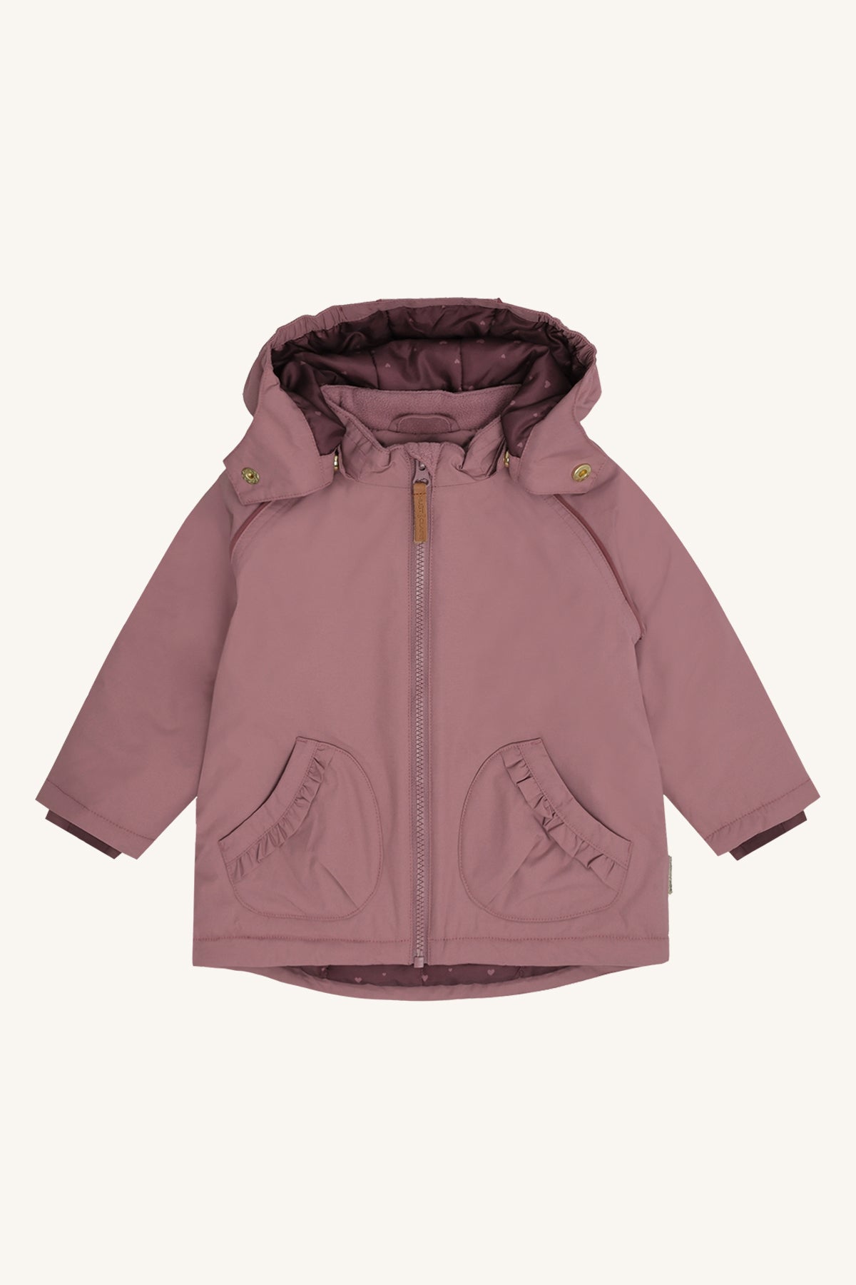 Fully lined winter jacket with detachable hood and front pockets with ruffles. The jacket features a snow skirt with a small thumb hole. Reflective ribbed edges are on the hood and shoulders. The jacket closes with a zipper along the front and can be tightened at the bottom with a drawstring.