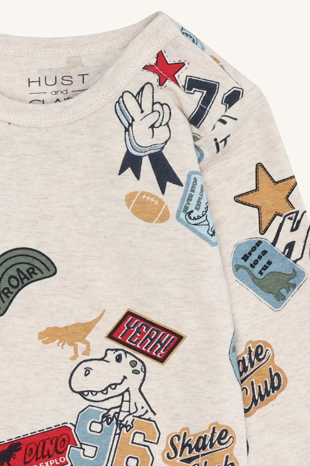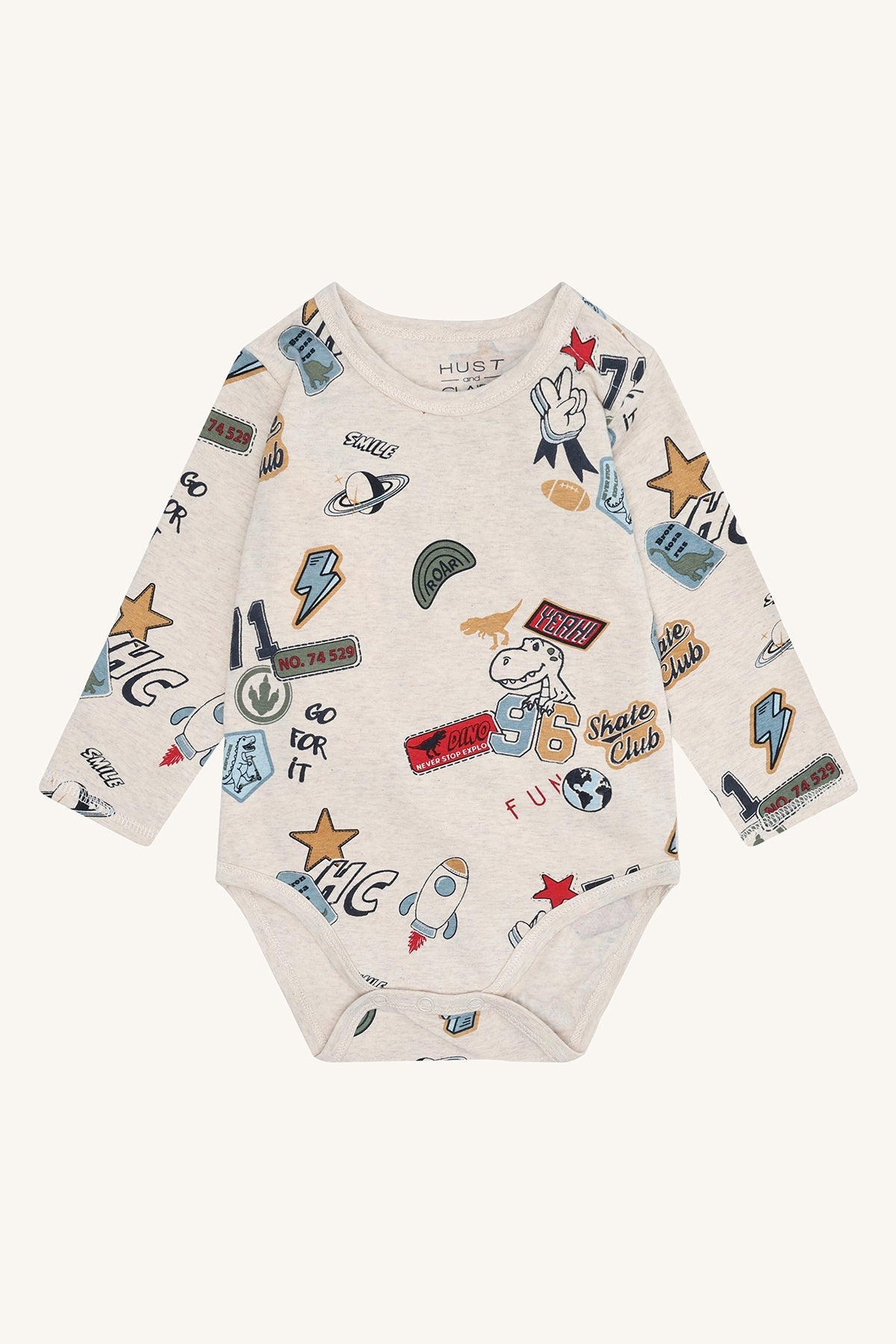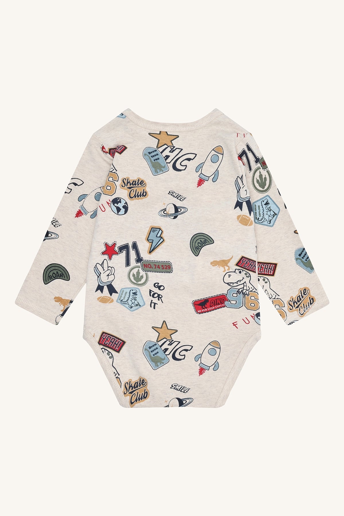 Long-sleeved body in Wheat Melange, made from 95% organic cotton and 5% elastane. Features 2 buttons on the left shoulder and 3 between the legs for easy dressing, decorated with a fun sticker badges all-over print for playful style.