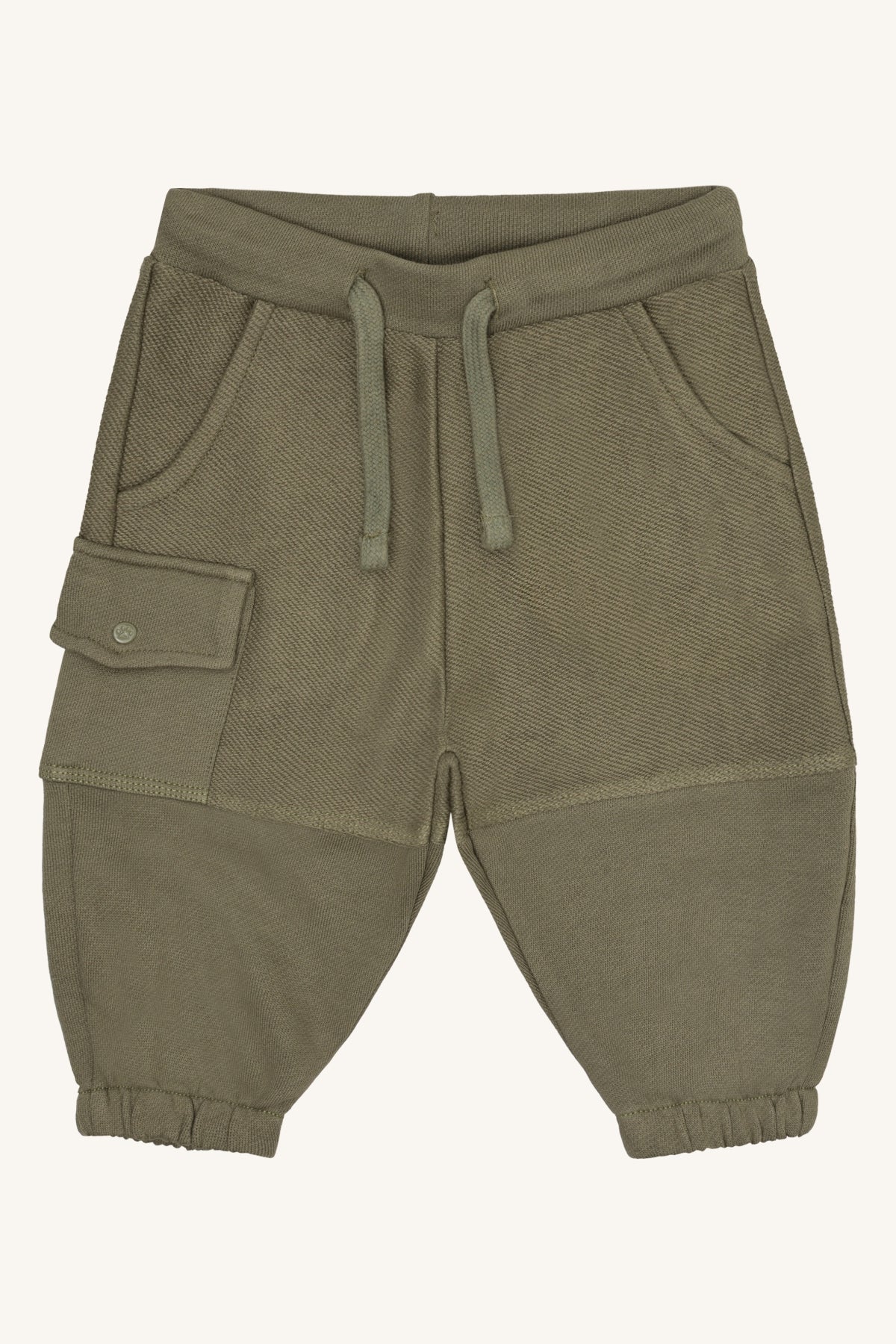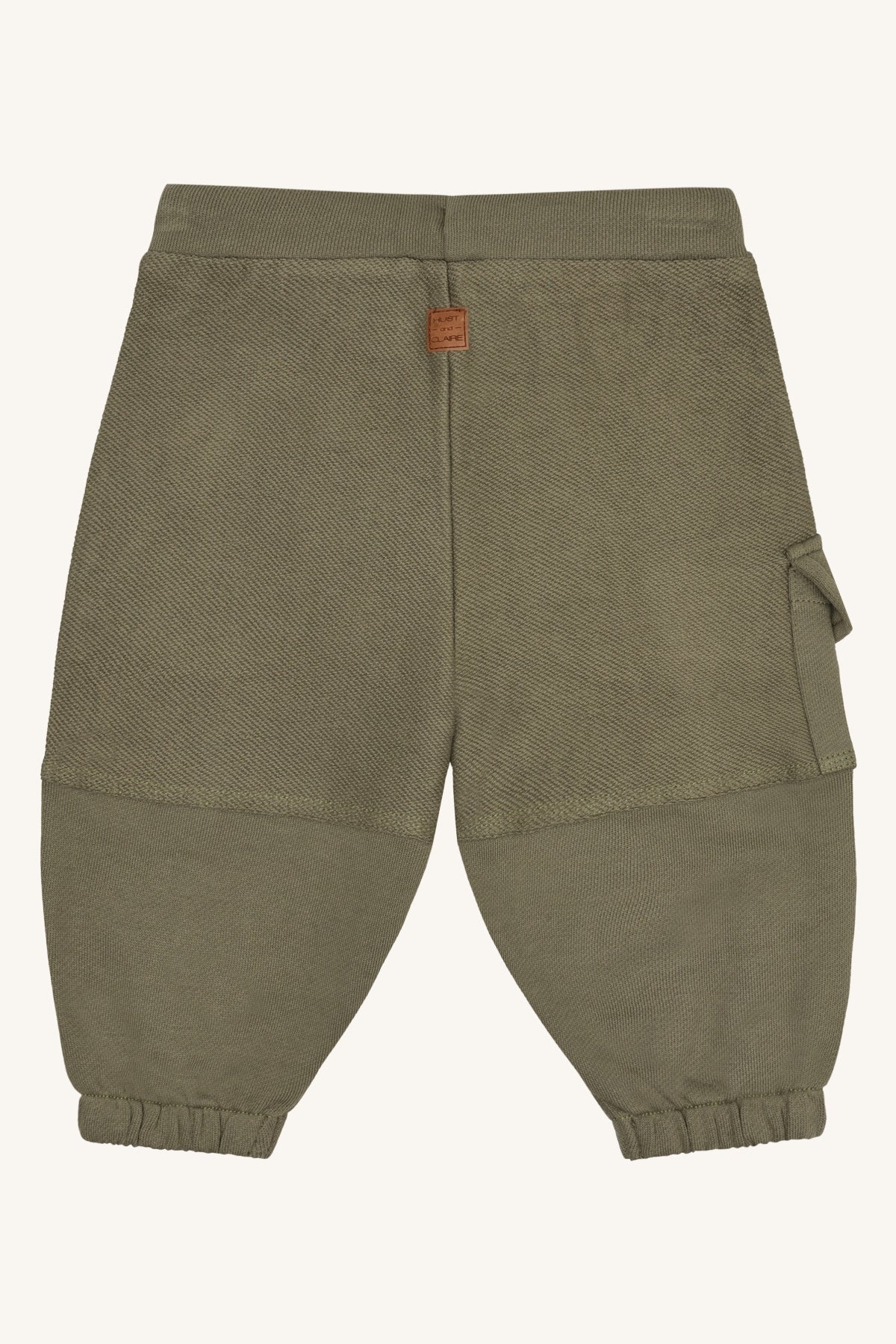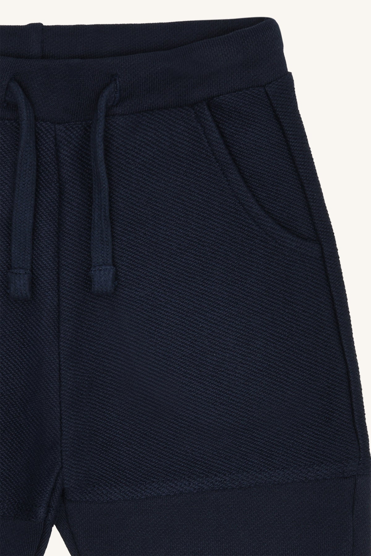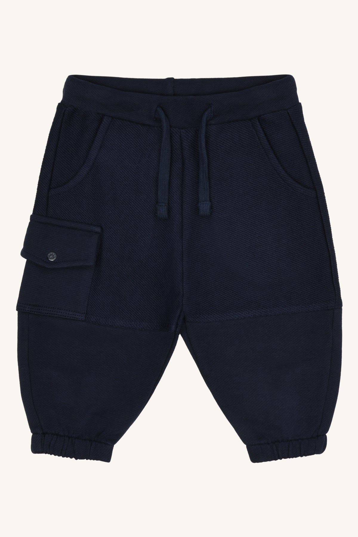 Organic cotton jogging pants in Turtle and More Navy, certified GOTS. Features a comfortable drawstring waist, practical side pockets, and cuffed edges for a snug fit. Perfect for active kids seeking eco-friendly, soft, and durable everyday wear.